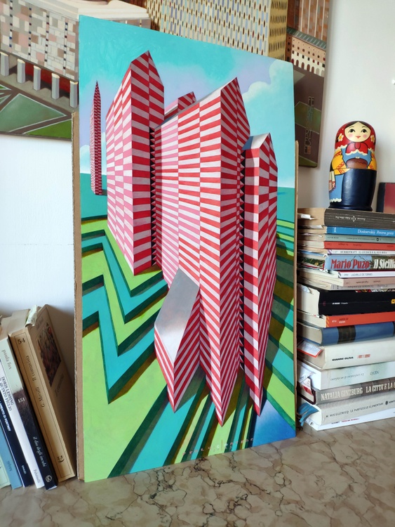 An original piece from the series “Virtual model”, oil on thick paper, 35 x 63 cm, 2023. I like to create imaginary worlds. I invent virtual simplified realities, probably the result of travel memories and past experiences. I choose the types of buildings, I place them on a fictitious ground, check the colors of the various parts, the lights, the elements of the landscape. And then I choose a point of view and portray this place of fantasy. The traditional landscape painting has to deal with the atmospheric variables, with the mutability of natural light. Here, on the contrary, not only everything is static, but I can change the various elements at will: add or remove pieces, move something, try the effects of shadows depending on the movement of the lights. But it is a small difference, and also the difference between "real" reality and virtual reality is now small: it has become part of our daily lives, changed our way of perceiving, and somehow has itself become real. In case of sale shipping is worldwide free.