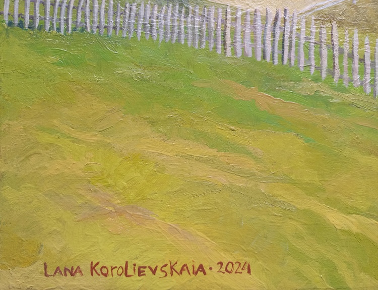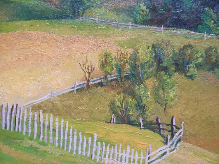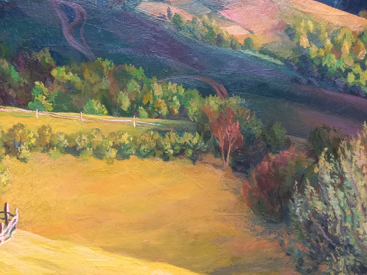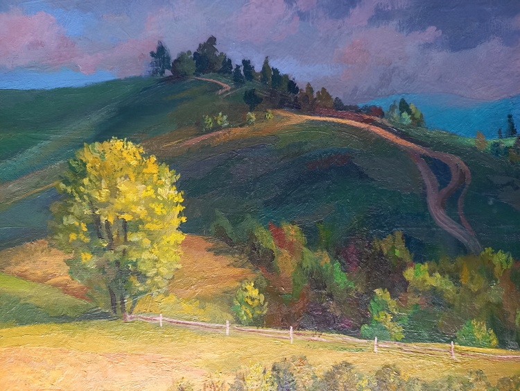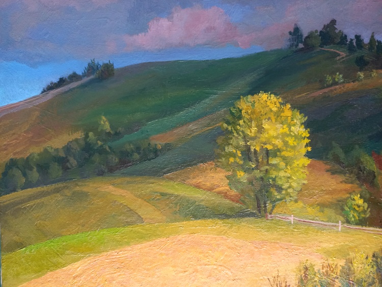 A rural landscape is bathed in the soft glow of sunset. The final rays of sunlight touch the earth, filling it with warmth and stillness. The sky shifts through gentle tones of violet and dusty pink as nature pauses before nightfall. This painting captures a fleeting moment of peace and invites the viewer to remember the quiet light that lingers long after the day is gone.