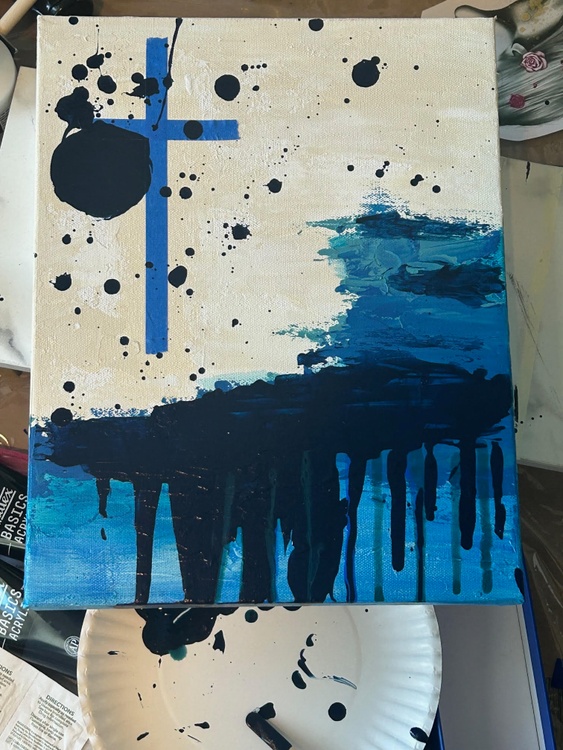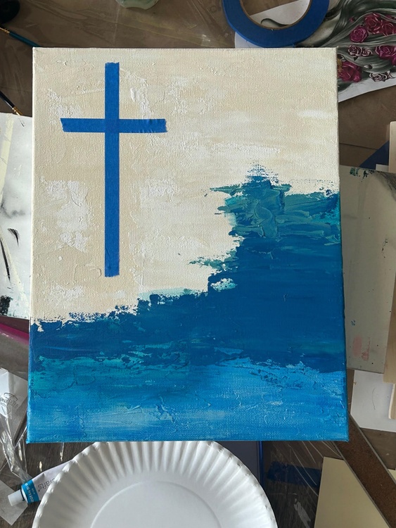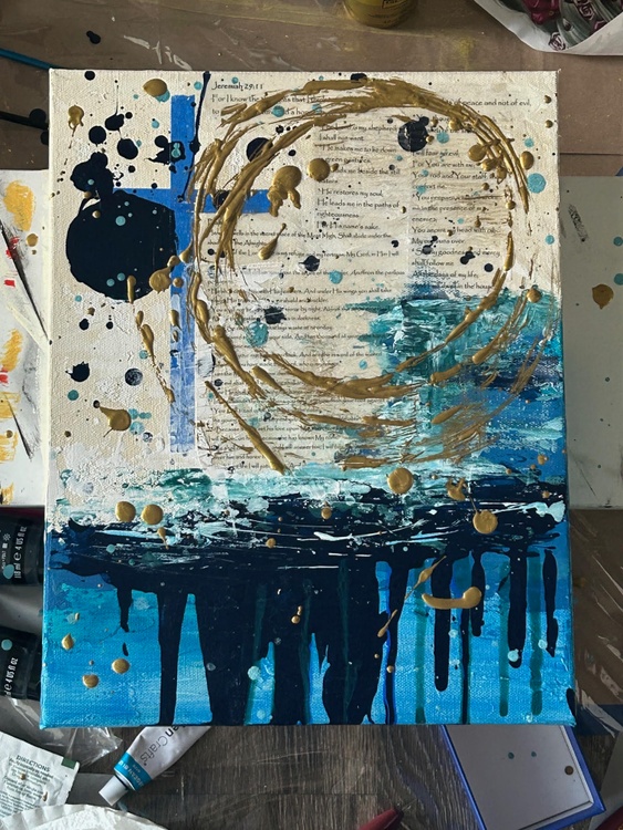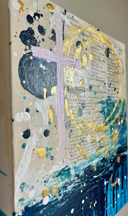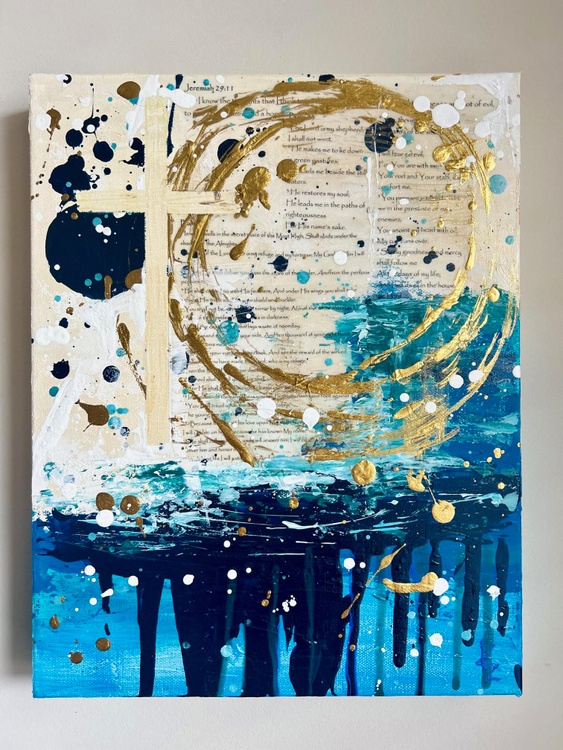 28 in x 22 in (71.1 cm x 55.9 cm); Unique Work, (1 of 1); "Blessed Daye" is a vibrant and textured painting that captures the essence of faith and hope. Using a combination of acrylic paint, dragonfly glaze, and texture, the artist creates a visually striking piece that evokes feelings of peace, tranquility, and spiritual connection. The painting features a central cross, a symbol of Christian faith, rendered in a bold, abstract style. The cross is surrounded by a swirling cascade of blue and gold, reminiscent of water and the divine light. The artist's use of texture adds depth and dimension to the painting, making it feel almost tangible. The background is a collage of bible scriptures, which subtly permeate the canvas, adding a deeper layer of meaning to the artwork. The overall effect is one of spiritual beauty and serenity. The painting invites the viewer to contemplate the power of faith and the transformative nature of water. The use of bright, vibrant colors creates a sense of joy and hope, while the texture and scriptural references add a sense of depth and complexity. "Blessed Daye" is a powerful and evocative piece of art that is sure to inspire and uplift the spirit. It's a reminder that even in the midst of life's storms, there is always hope and light to be found.