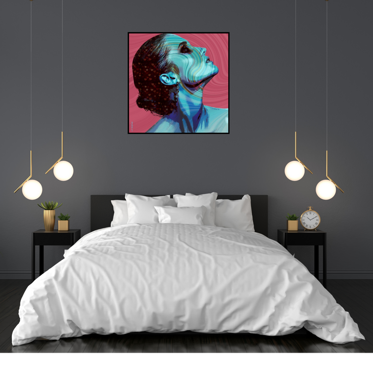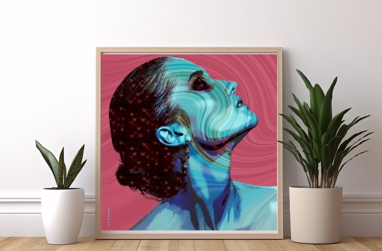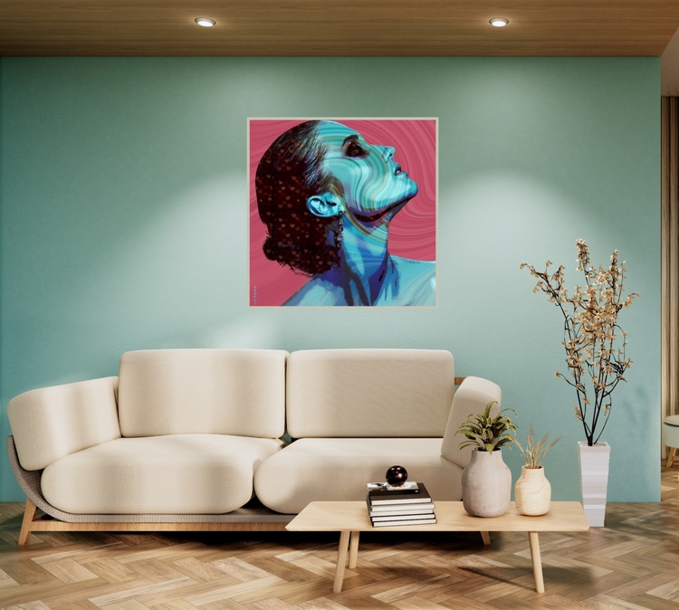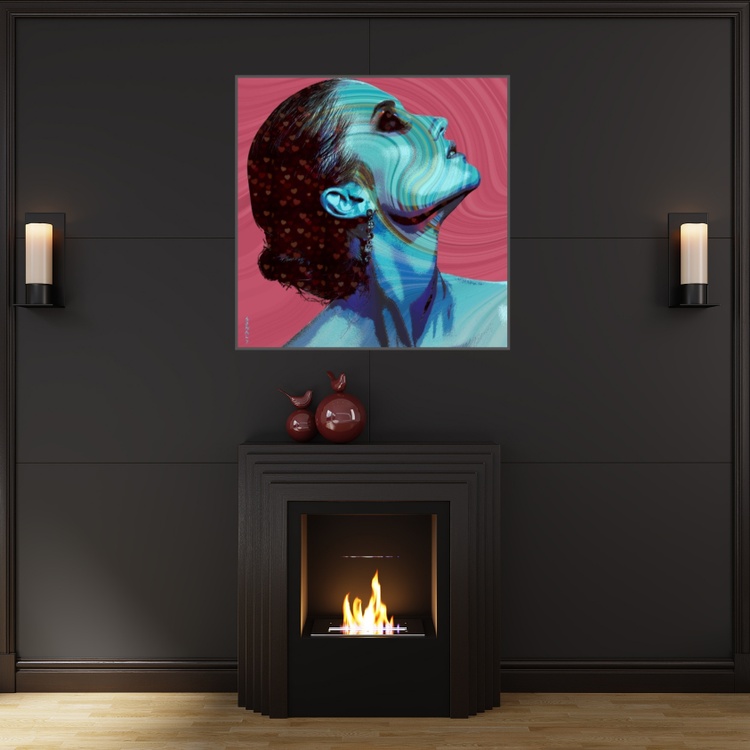 This artwork captures a moment of pure reverie—a glimpse into the soul of a dreamer. Her head tilted slightly upward, eyes closed, she seems lost in a world of infinite possibilities. The vivid blue tones that envelop her are a testament to the boundless nature of her dreams, representing both the depths of her emotions and the sky-high ambitions she dares to pursue. What truly sets this piece apart are the swirling, multicolored abstract patterns that ripple across her face and neck. These fluid lines suggest a merging of her inner dreams with the outer world, as if she is dissolving into a grander vision, seamlessly blending with the universe around her. It’s as though she has become one with the bigger picture, embracing the ebb and flow of life’s mysteries. The background echoes this dreamlike merging, with hypnotic waves that seem to dance in harmony with the contours of her face, creating a sense of unity and wholeness. Her hair, adorned with a constellation of delicate hearts, conveys the enduring power of love. It speaks to the idea that even within her most otherworldly dreams, love is a guiding force—something that grounds her and keeps her connected to what matters most. Every detail in *Dreamscape Reflections* invites you to pause and reflect. Can you find yourself in her journey? Do you, too, dream vividly, with love as your compass and the universe as your canvas? This piece, available as a Limited Edition Giclée Print, is a celebration of dreams, love, and the way our inner worlds shape and merge with the reality around us. This artwork is not just a visual experience—it’s an invitation to dream boldly and love deeply, to see your own story reflected within her