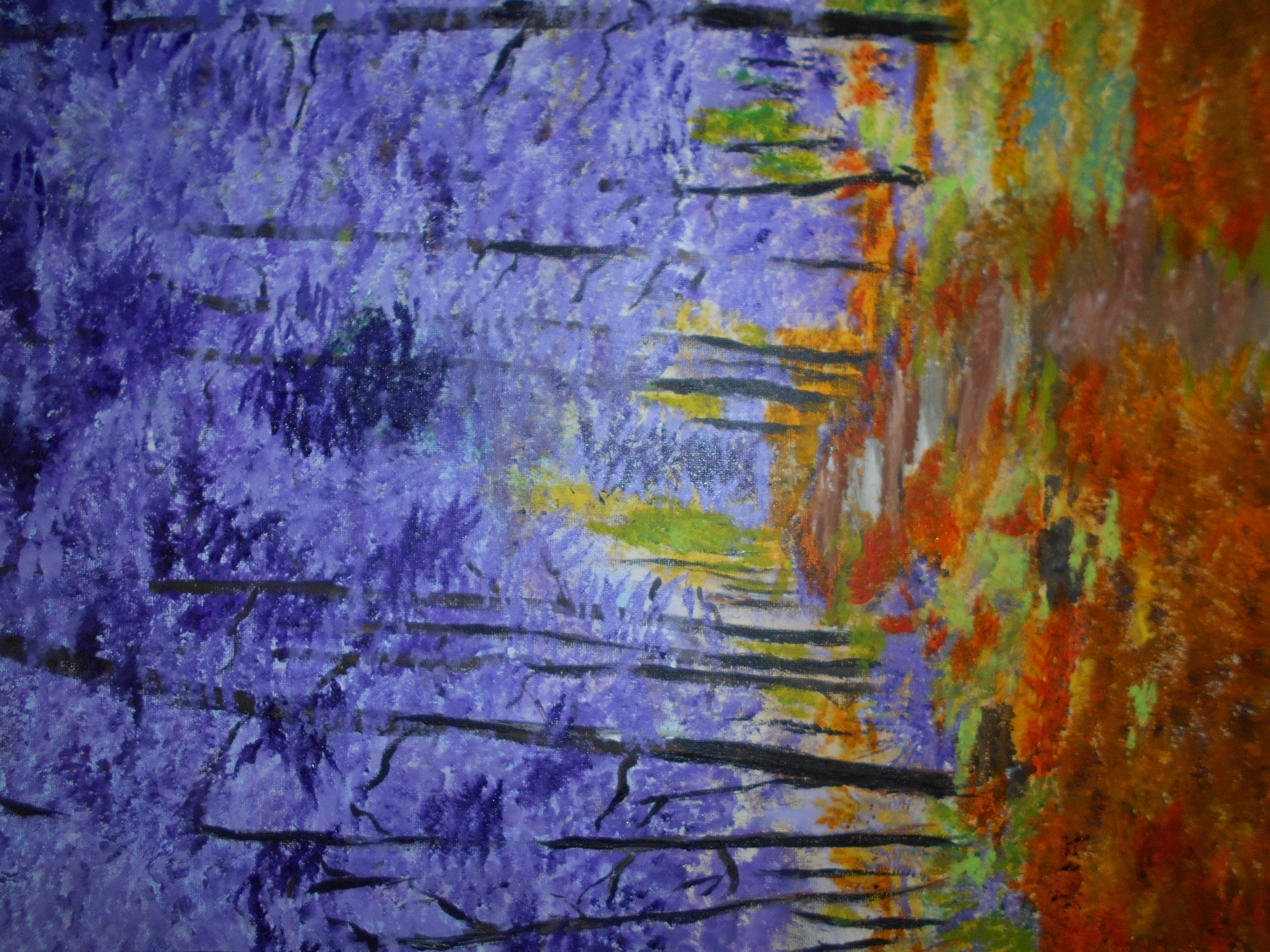 The beauty of walking down a wooded path surrounded by beautiful purple trees, this is a original acrylic painting