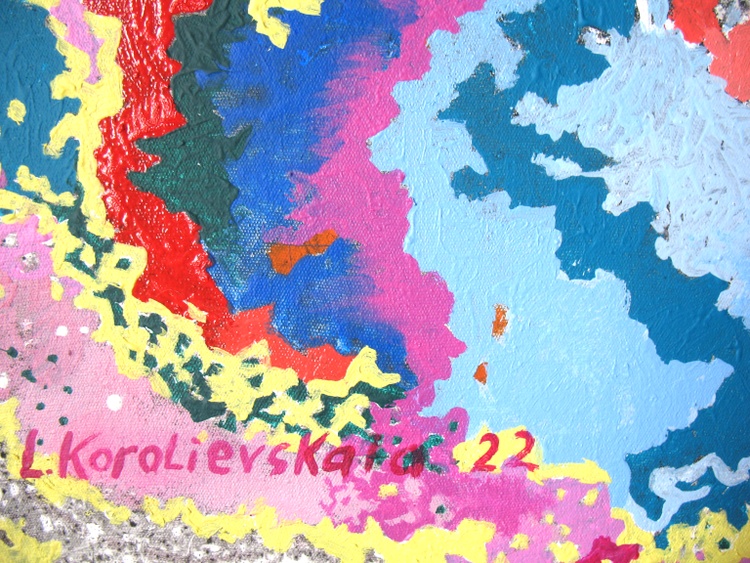 The canvas is densely covered with bright, irregular shapes representing tension and spatial competition. The forms resist merging, like incompatible substances. Outlined in white, they emphasize division and non-cooperation. The dynamic displacement of color and shape conveys instability — a visual impression of elements in motion, not yet fused into chaotic uniformity. This structural tension reflects broader systemic imbalance. The work speaks to the collision of opposing interests — between nations, regimes, ideologies, and populations. It becomes a metaphor for global shifts extending far beyond a single region. The composition marks an early stage in what may be seen as a wider systemic reset.