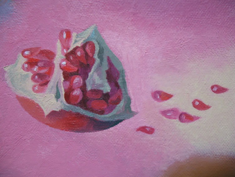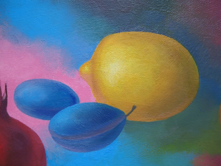The picture is based on the idea of the interdependence of the visible and sensually perceived world, the taste of fruits and the aftertaste after meal. Fruits: plums, pomegranate, pear, lemon, quince, persimmon – froze on an abstract background. They are accents of colored spots that gently flow into each other. An abstract background has internal energy, directing its impulses to the viewer, infecting him with its positive mood.