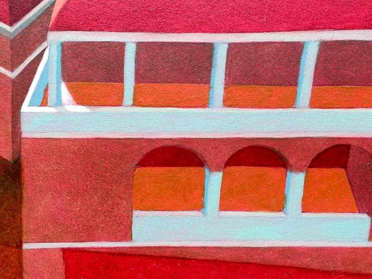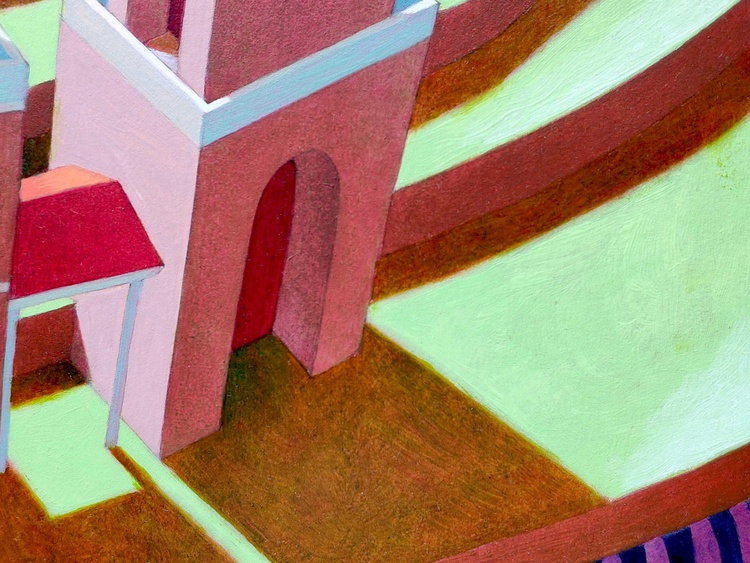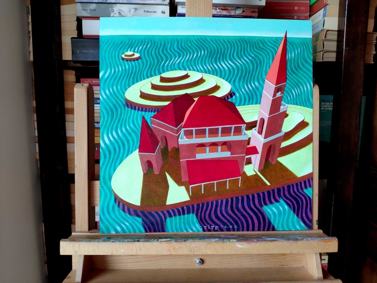 From the series “Virtual model”, oil on thick paper, 40 x 40 cm. I like to create imaginary worlds. I invent virtual simplified realities, probably the result of travel memories and past experiences. I choose the types of buildings, I place them on a fictitious ground, check the colors of the various parts, the lights, the elements of the landscape. And then I choose a point of view and portray this place of fantasy. The traditional landscape painting has to deal with the atmospheric variables, with the mutability of natural light. Here, on the contrary, not only everything is static, but I can change the various elements at will: add or remove pieces, move something, try the effects of shadows depending on the movement of the lights. But it is a small difference, and also the difference between "real" reality and virtual reality is now small: it has become part of our daily lives, changed our way of perceiving, and somehow has itself become real. Free shipping worldwide.