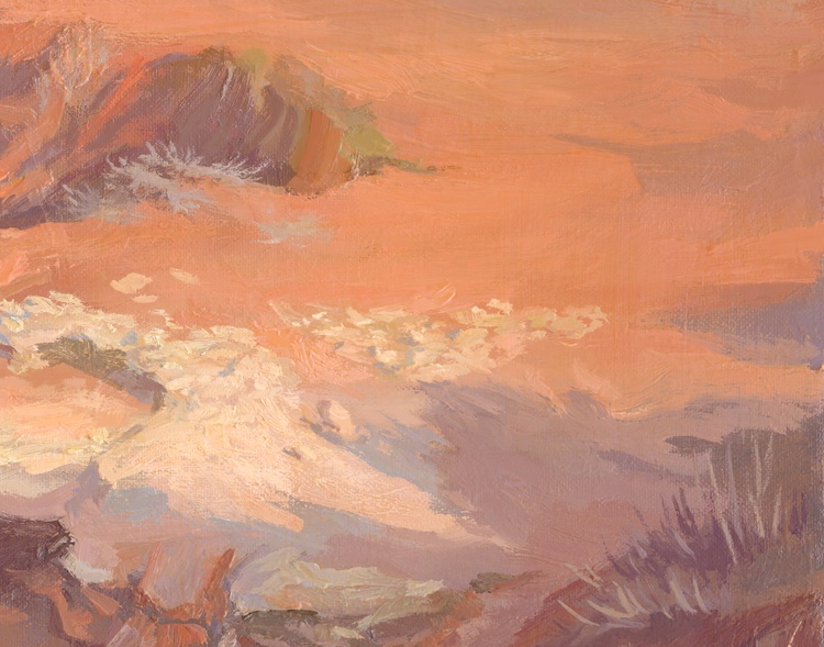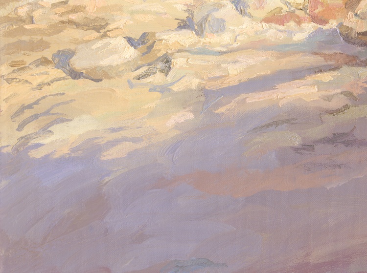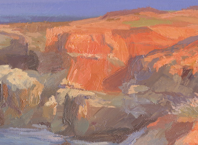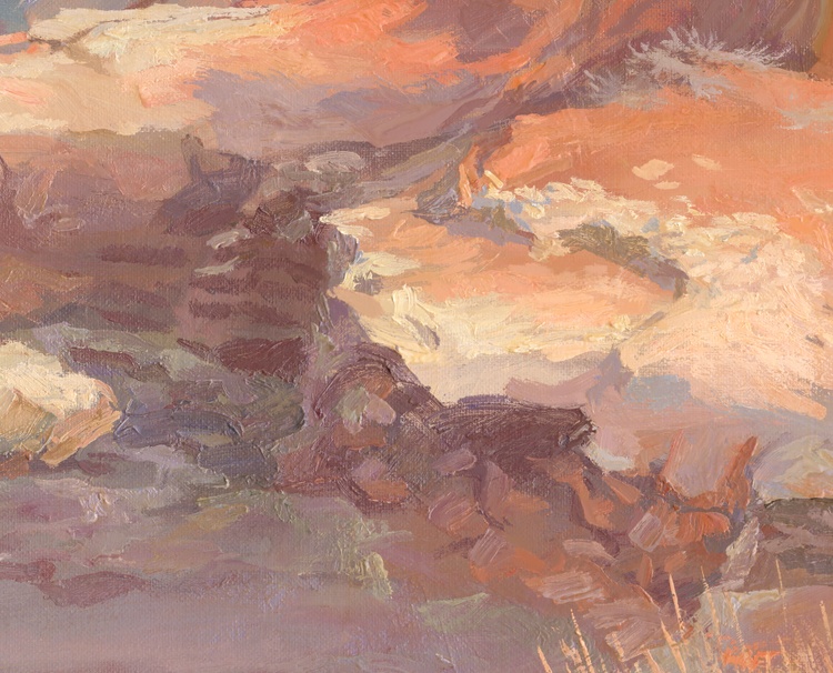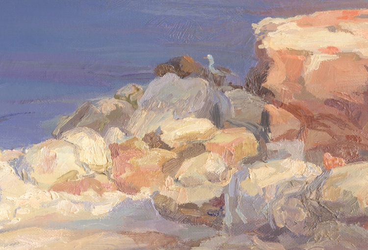 A romantic evening by the sea is an indescribable pleasure. Contemplation of nature, changing every minute, teaches a person to appreciate every moment of his life and live in the present - here and now. The sound of waves hitting a rocky shore contains many meanings and is capable of initiating an internal dialogue in any person who is even a little bit of a philosopher. For example, the element of water may turn out to be our individual unconscious, concealing the unknown in its depths, a viscous pulsating mass that knows no rest, capable of raging under certain circumstances. The shore is solid and unchanging in its form, it represents consciousness - the external, knowable form of our personality. The conscious and the unconscious meet each other at this line of contact. Water can flood the shore, wear away the stone, but it can also retreat, exposing the bottom. The land was once covered by the ocean, and the bottom of the oceans were dry valleys. Everything is changeable, like human existence. Only the menacing gloomy sky, towering over the world, silently watches everything that happens from the height of its perfection, sometimes crying with rain, sometimes smiling with the sun, and sometimes covering everything with a layer of clouds in order to take a short rest from its duty. Only a couple of minutes have passed, but what profound thoughts have flashed through your head, oh art lover. Give yourself the unique opportunity to own this painting, in which eternity is frozen in one motionless frame.