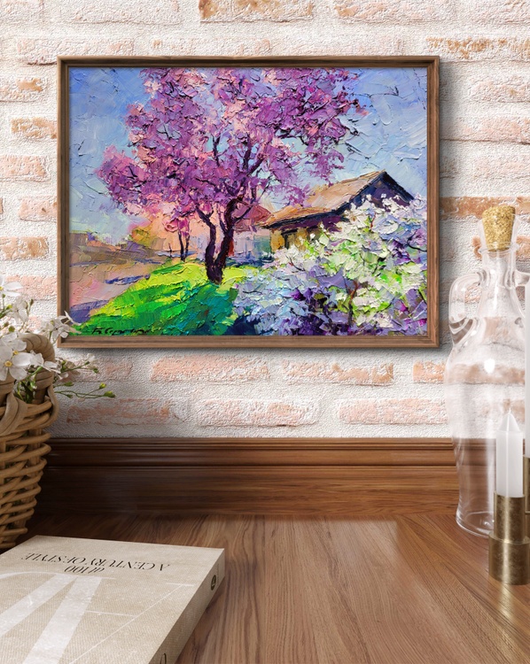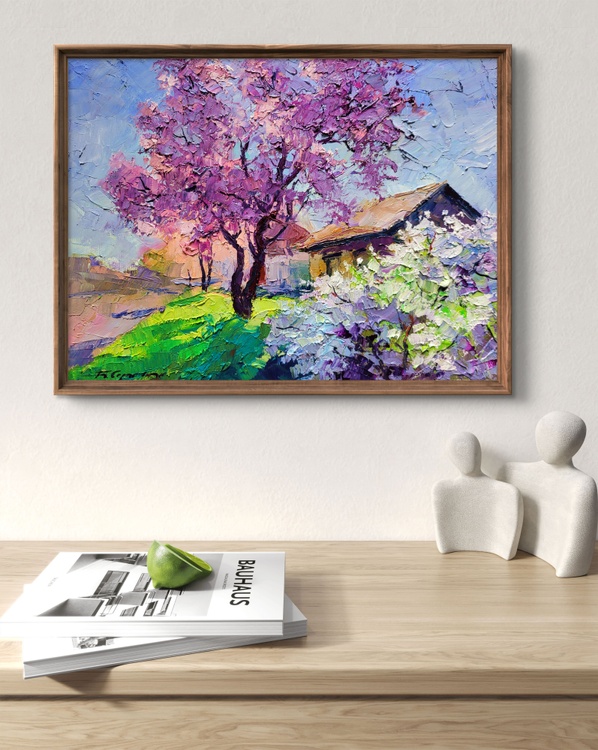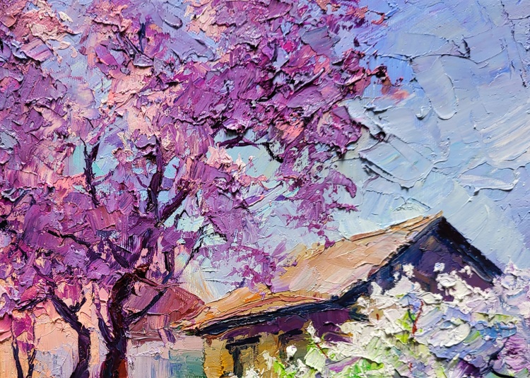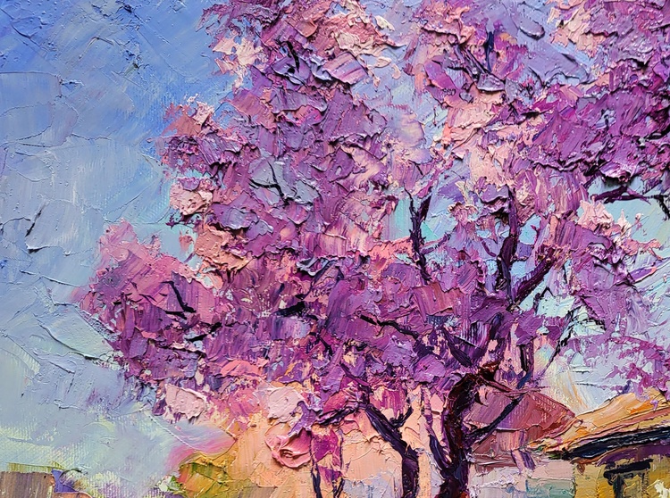 The painting titled "May" captures the beauty and charm of a blossoming spring day in a rural setting. The centerpiece of the composition is a tall tree covered in lush pink blossoms, symbolizing the full bloom of nature during May. The tree stands proudly in the middle of a bright, sunlit garden, casting playful shadows on the vibrant green grass below. The blossoms, painted with thick, textured brushstrokes in shades of pink and purple, create a sense of movement and life, as if a gentle breeze is rustling through the branches.In the background, a modest rural house with a thatched roof sits quietly under the bright sky. The house’s walls, painted in soft yellow and earthy tones, reflect the sunlight, adding warmth to the scene. The house blends seamlessly into the surrounding landscape, suggesting a peaceful coexistence between human life and nature.To the right of the tree, a white flowering bush adds another layer of beauty to the composition. The contrast between the pink blossoms of the tree and the white flowers of the bush creates a harmonious balance, enhancing the overall sense of renewal and vitality that spring brings. The greenery surrounding the house and garden is painted in various shades of green, adding depth and richness to the scene.The sky above is a clear, light blue with hints of soft pastel colors, suggesting a calm and peaceful day. The artist’s choice of color palette — a combination of bright greens, warm yellows, soft blues, and vibrant pinks — evokes feelings of joy, hope, and the celebration of life.Through "May," the artist aims to convey a message of renewal, growth, and the beauty of nature’s cycles. The painting reflects the spirit of spring — a time of rebirth and new beginnings, when the world bursts into color and life after the long, dormant winter months. The blossoming tree symbolizes hope and the promise of a fruitful season ahead.The painting invites viewers to appreciate the simple beauty of rural life and the wonders of nature’s transformations. It evokes feelings of warmth, peace, and a connection to the natural world. Ultimately, "May" is a celebration of spring’s arrival, reminding us to cherish the fleeting moments of beauty and renewal that this season brings. The vibrant colors and lively brushstrokes create a sense of energy and optimism, encouraging viewers to embrace the joy and vitality of life in full bloom. 1120