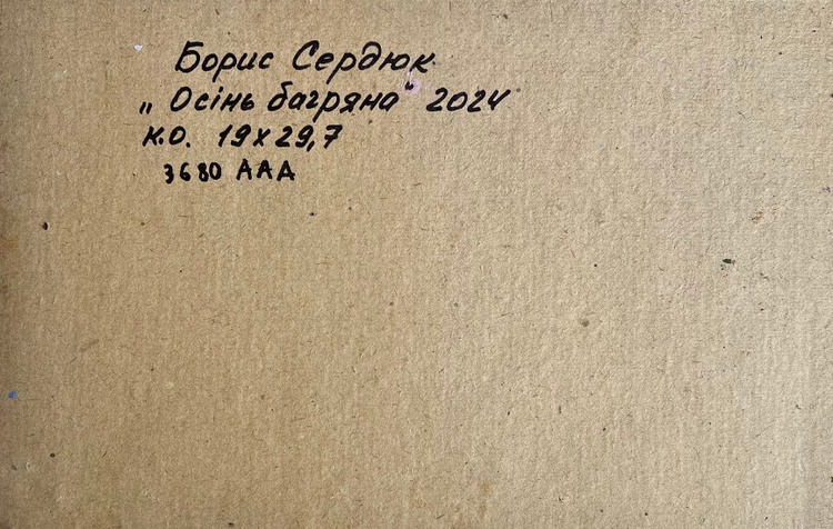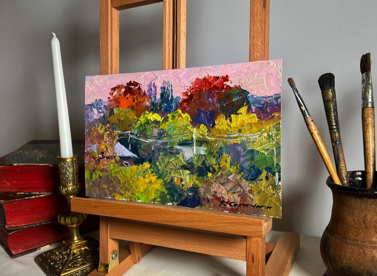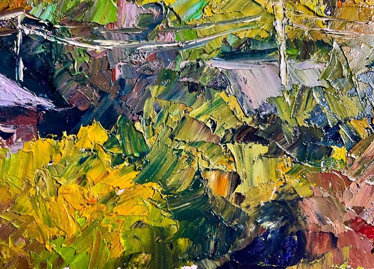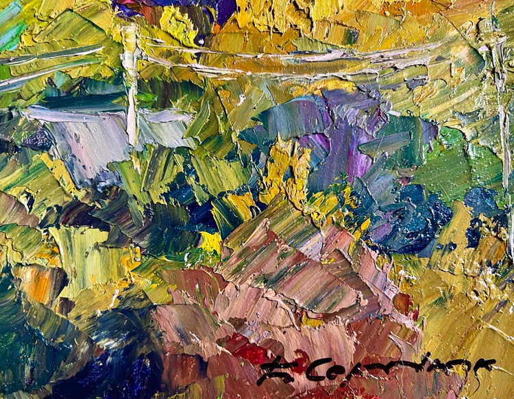 "Crimson Autumn" is a striking Oil painting on cardboard that showcases the brilliance of autumn foliage in a rural setting. The artist uses bold, textured brushstrokes and the impasto technique to create a highly expressive and dynamic landscape, capturing the vibrancy of the season.The foreground is dominated by rich shades of green, yellow, and ochre, depicting dense foliage that has begun its transition from the warmth of summer to the golden hues of fall. The thickness of the paint gives depth to the vegetation, making the scene feel almost tangible. The chaotic yet harmonious layering of colors conveys the lushness and fullness of nature before the arrival of winter.Nestled within the foliage, two modest rural houses are partially visible, their rooftops blending into the landscape. Their subdued tones contrast with the brilliance of the trees, emphasizing the dominance of nature over human habitation. A set of thin, white lines, possibly power lines, stretches across the composition, subtly reminding us of human presence without detracting from the natural beauty.The middle ground features an explosion of fiery reds and deep oranges, representing trees in peak autumn bloom. These colors are intensified against the softer hues of the sky, which is painted in a delicate pink, lending the scene a dreamlike quality. The contrast between the warm and cool tones enhances the depth and visual appeal of the composition.In the background, tall, dark blue and purple trees rise above the horizon, adding a sense of structure and balance to the painting. Their cool tones provide contrast to the warm autumn colors, creating a sense of harmony. The sky, with its gentle pastel pink hues, suggests the soft glow of an evening sunset, casting a warm light over the landscape.Through "Crimson Autumn," the artist conveys a sense of nostalgia and appreciation for the fleeting beauty of fall. The intense colors and expressive brushwork evoke the energy and transformation of nature, reminding the viewer of the cycle of the seasons. The painting celebrates the richness of life, the warmth of rural settings, and the quiet yet powerful presence of nature in its most colorful and dramatic phase. 3680