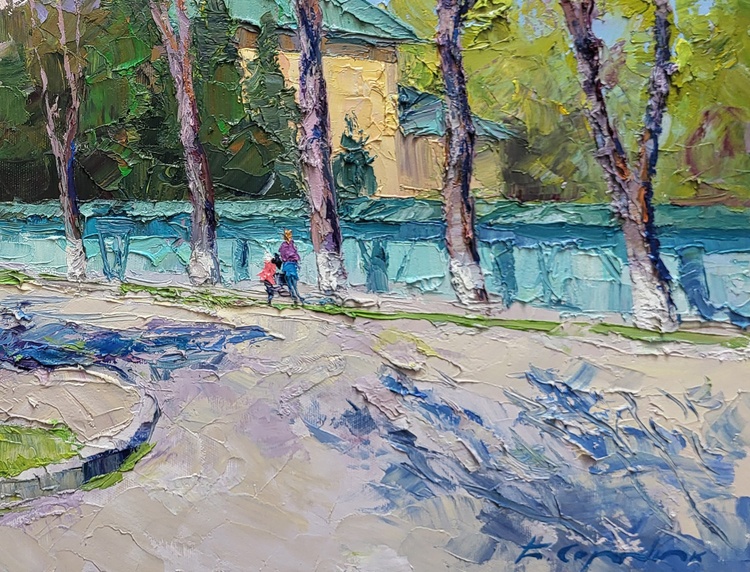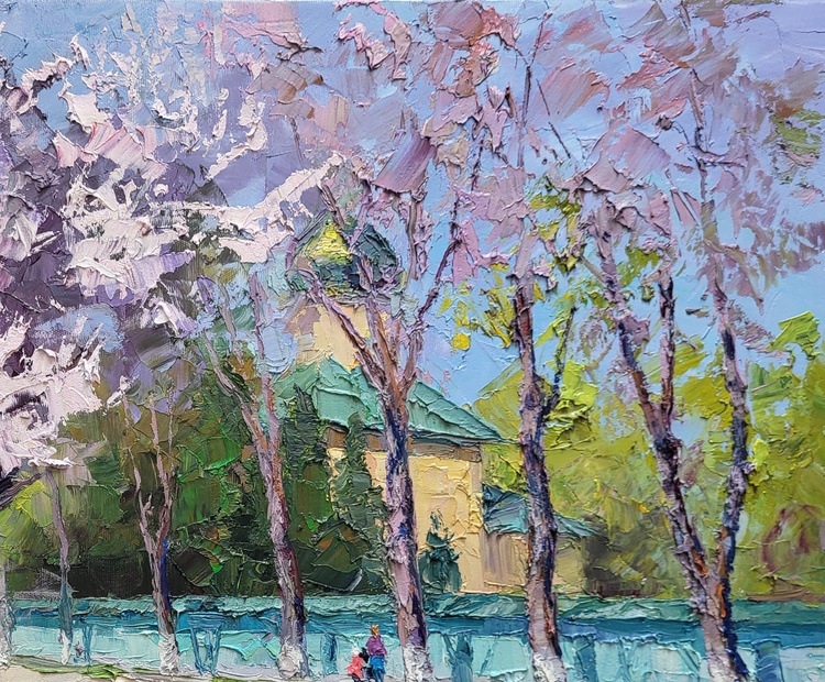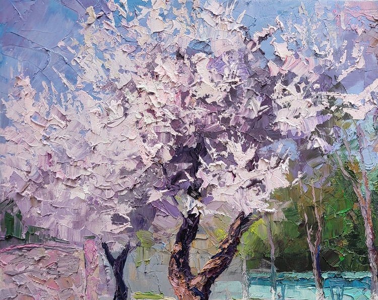 "Apricot Blossom" is an exquisite oil painting that encapsulates the vibrant and delicate beauty of spring. The artwork features a serene street scene, where the focal point is a blooming apricot tree adorned with soft, pastel-colored blossoms. The artist has skillfully used thick, impasto brushstrokes to bring the tree to life, with its blossoms appearing almost three-dimensional, bursting with hues of pink, white, and purple. The foreground showcases the apricot tree in full bloom, its gnarled trunk and branches adding a sense of age and wisdom to the scene. The blossoms create a canopy of color that contrasts beautifully with the lush green grass at the tree's base, where the light dances and creates a mosaic of shadows. To the right, a paved pathway curves gently, leading the viewer's eye towards the background. Here, more trees are depicted, their trunks painted with a similar thick texture, but in a less detailed manner, allowing the apricot tree to remain the star of the composition. The shadows of these trees stretch across the path, adding depth and a sense of peaceful continuity to the painting. In the midground, a figure in a pink coat walks along the path, adding a touch of human presence to the tranquil setting. The person seems to be enjoying the beauty of the spring day, contributing to the overall mood of relaxation and contemplation. In the background, a building with a green roof and yellow walls is partially visible through the trees. This structure adds an architectural element to the painting, grounding the scene in a specific locale. The blue fence that runs parallel to the path provides a cool counterbalance to the warm tones of the apricot blossoms and the greenery. The sky above is painted in light, airy shades of blue, complementing the overall color palette and enhancing the feeling of a clear, crisp spring day. The light and shadow interplay is masterfully handled, creating a harmonious and inviting atmosphere. "Apricot Blossom" is a celebration of nature's renewal and the simple pleasures of a walk on a beautiful spring day. The painting's rich textures, vibrant colors, and serene composition make it a captivating piece that invites viewers to pause and appreciate the fleeting beauty of spring blossoms. 1079