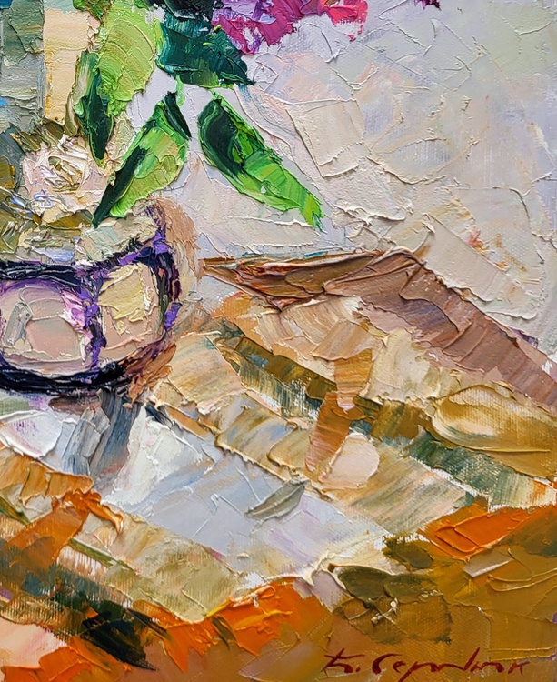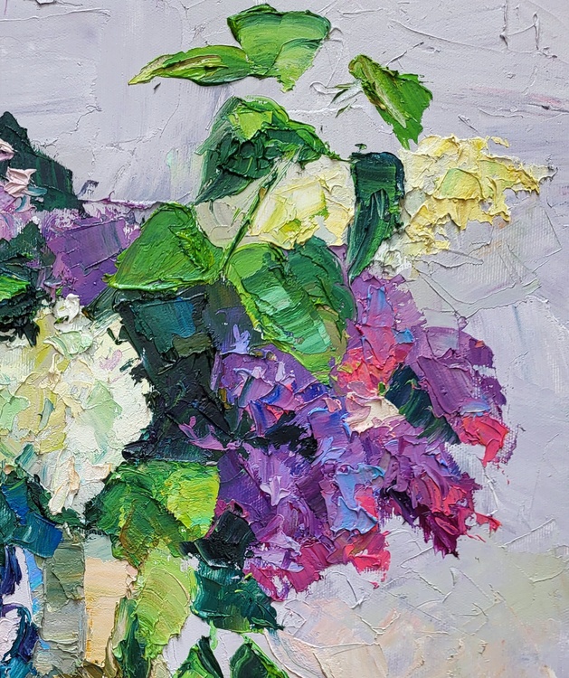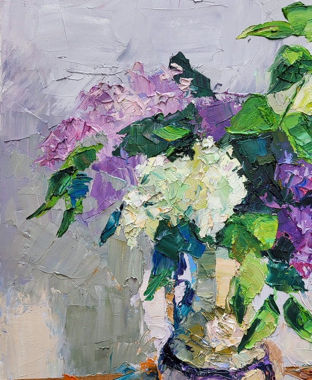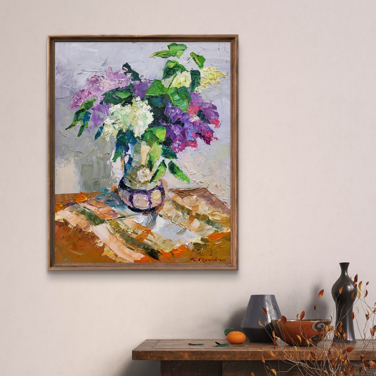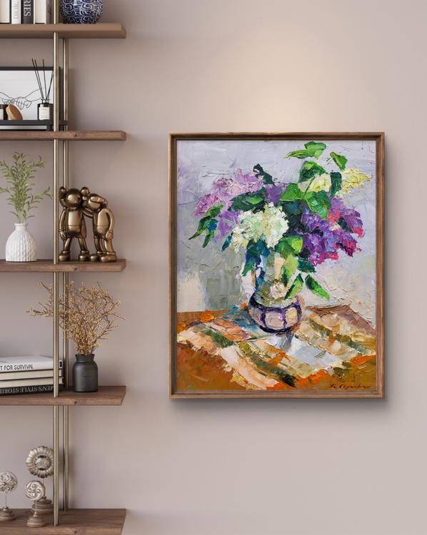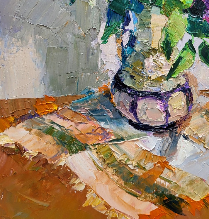 "Lilac in a Flowerpot" is a beautiful still-life oil painting that captures the delicate beauty and vibrant colors of lilac flowers arranged in a flowerpot. The painting showcases the artist's masterful use of texture, color, and light to bring a simple yet elegant composition to life. At the center of the painting is a bouquet of lilac flowers in full bloom, contained in a charming flowerpot. The lilacs are depicted in various shades of purple, pink, and white, their blossoms rendered with thick, textured brushstrokes that give them a lifelike, three-dimensional quality. The flowers are complemented by lush green leaves, which add a refreshing contrast to the vibrant blooms. The flowerpot itself is intricately painted, with its rounded shape and subtle color tones providing a stable base for the lively bouquet. The pot sits on a table that features an array of warm, earthy tones, including shades of orange, brown, and beige. These colors are applied in broad, textured strokes, creating a dynamic surface that contrasts with the more delicate treatment of the flowers. The background of the painting is kept relatively simple, with soft, muted tones of gray and light purple. This neutral backdrop helps to highlight the vivid colors of the lilacs and leaves, ensuring that the bouquet remains the focal point of the composition. Light plays a crucial role in this painting, casting soft shadows and reflections on the table surface and the flowerpot. The interplay of light and shadow adds depth and dimension to the scene, enhancing the overall realism of the depiction. The artist's brushwork is expressive and dynamic, with thick applications of paint that create a sense of movement and vitality. This technique not only captures the natural beauty of the lilacs but also conveys the freshness and energy of the floral arrangement. Overall, "Lilac in a Flowerpot" is a stunning representation of nature's beauty, showcasing the artist's skill in combining color, texture, and light to create a captivating and lifelike still-life composition. The painting invites viewers to appreciate the intricate details and vibrant colors of the lilac flowers, evoking a sense of calm and admiration for the simple yet profound beauty of nature. 1082