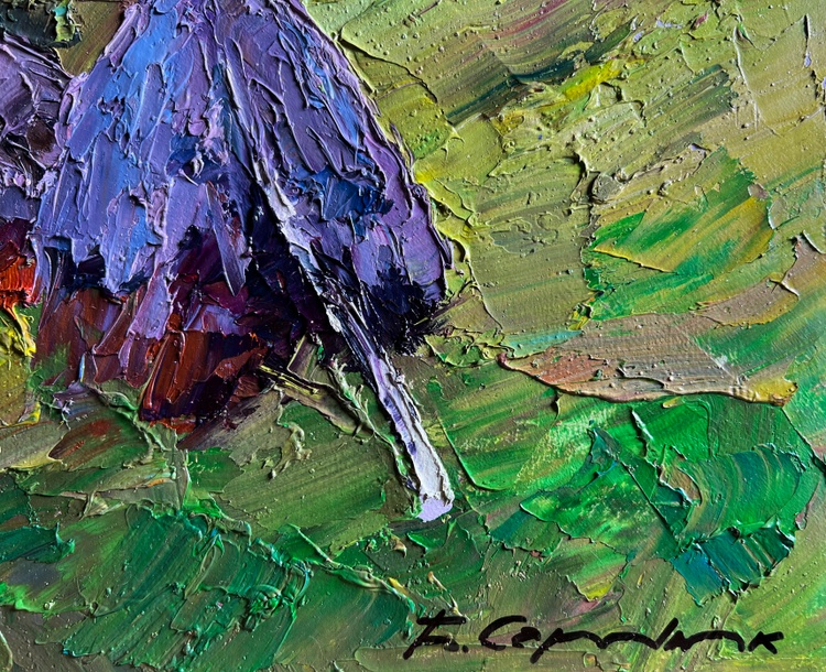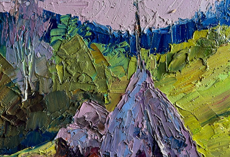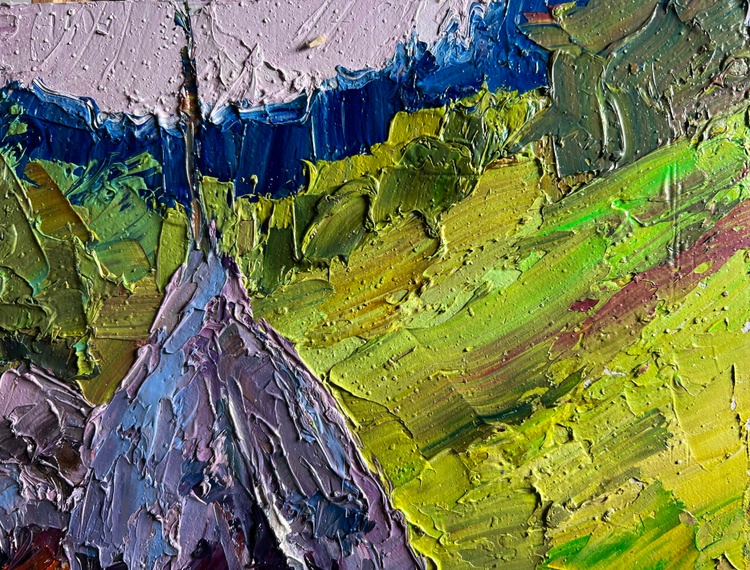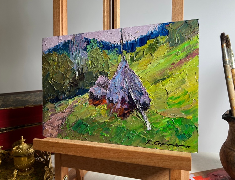 "Path to the Mountains" is a vibrant and textured Oil painting on cardboard that captures the rustic charm of a countryside landscape. The composition is dominated by rolling green hills, a winding dirt path, and traditional haystacks, set against the backdrop of distant blue-hued mountains. The artist employs thick, expressive brushstrokes, giving the piece a dynamic energy that enhances the depth and atmosphere of the scene.The foreground features a well-trodden dirt path leading toward the mountains, inviting the viewer into the painting and creating a sense of movement. The haystacks, positioned at the side of the path, stand as symbols of rural life, evoking feelings of warmth and tradition. Their rich mix of earthy browns, soft purples, and hints of blue contrast beautifully with the surrounding lush greenery, suggesting the play of light and shadow on their textured surfaces.The background is dominated by majestic mountains, softly blending into the sky. These mountains are painted in cool blue and purple tones, creating a sense of distance and vastness. The trees and foliage are depicted with a variety of greens, from bright lime to deep forest hues, adding richness and diversity to the natural setting. The sky is subtle yet expressive, with a soft pinkish hue that suggests either dawn or dusk, enhancing the peacefulness of the scene.Through "Path to the Mountains," the artist conveys a sense of harmony between nature and human life. The presence of the haystacks hints at agricultural labor, a connection to the land, and the seasonal cycles that dictate rural existence. The dirt path serves as both a literal and metaphorical journey, leading toward the unknown and symbolizing exploration, adventure, or a return to nature.This painting celebrates the simple beauty of pastoral life, highlighting the relationship between humans and the environment. It evokes a feeling of nostalgia, freedom, and tranquility, reminding the viewer of the quiet pleasures found in nature. The expressive, thick brushwork adds a tactile quality, making the scene feel alive and immediate, as if one could step into the landscape and experience the crisp mountain air.In essence, "Path to the Mountains" is more than just a landscape—it is an emotional journey. It invites contemplation, inspiring the viewer to pause and appreciate the timeless beauty of nature and the peaceful coexistence of people within it. 3700