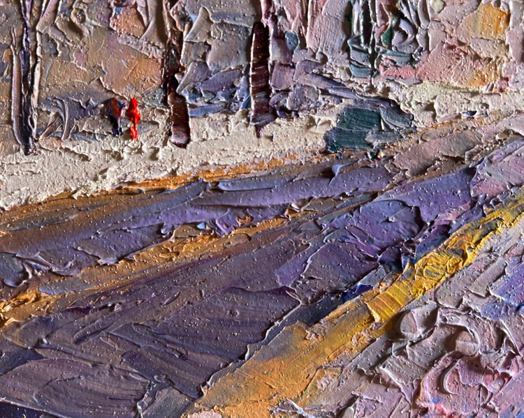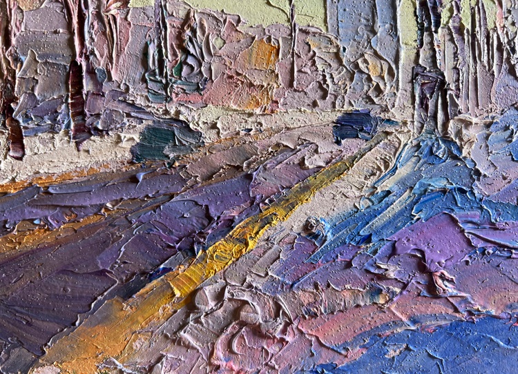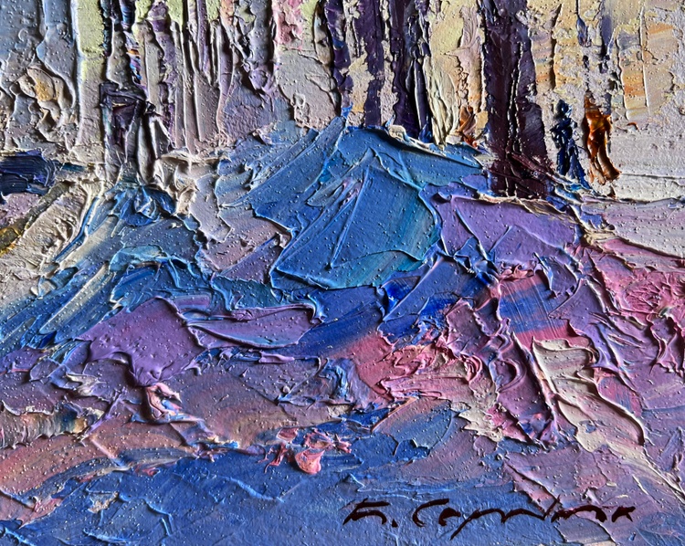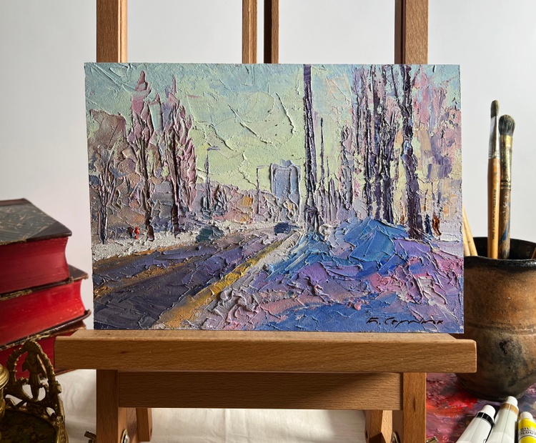 The painting "After the Night Snowstorm" beautifully captures a winter morning in the city, where the fresh snow blankets the streets and sidewalks. The artist employs an impasto technique, using thick, expressive strokes of oil paint to bring texture and life to the scene. The palette is dominated by cool shades of blue, purple, and white, contrasted by the warm golden hues of the rising sun that softly illuminate the buildings and treetops.The composition leads the viewer’s eye down a snow-covered avenue, where tire tracks carve dark lines into the icy road, creating depth and perspective. The trees lining the street are tall and bare, their branches tinged with hints of pink and lilac, reflecting the morning light. The interplay of colors gives the impression of a crisp, cold morning air, filled with a sense of renewal after a turbulent night.In the distance, silhouettes of buildings rise through the winter haze, partially obscured by the frost-laden atmosphere. A few figures walk along the sidewalk, their dark shapes adding a human presence to the otherwise serene landscape. Their movements seem slow and deliberate, as if they are carefully navigating the icy paths. The vehicles on the road, painted with just a few simple yet effective strokes, suggest the quiet resumption of daily life after the storm.The artist masterfully conveys the contrast between the harshness of the snowstorm and the peacefulness that follows. The thick layers of snow piled along the sidewalks, painted with bold strokes of violet and blue, highlight the strength of nature, yet they also emphasize the beauty and purity of the winter landscape. The golden glow breaking through the cold tones brings warmth to the composition, evoking a sense of calm and hope.Through "After the Night Snowstorm," the artist invites the viewer to experience the tranquility of a winter morning, where the city momentarily slows down, embracing the silent beauty of freshly fallen snow. The painting captures the fleeting magic of a winter day, where the chaos of nature gives way to quiet reflection, resilience, and the promise of a new beginning. 3710
