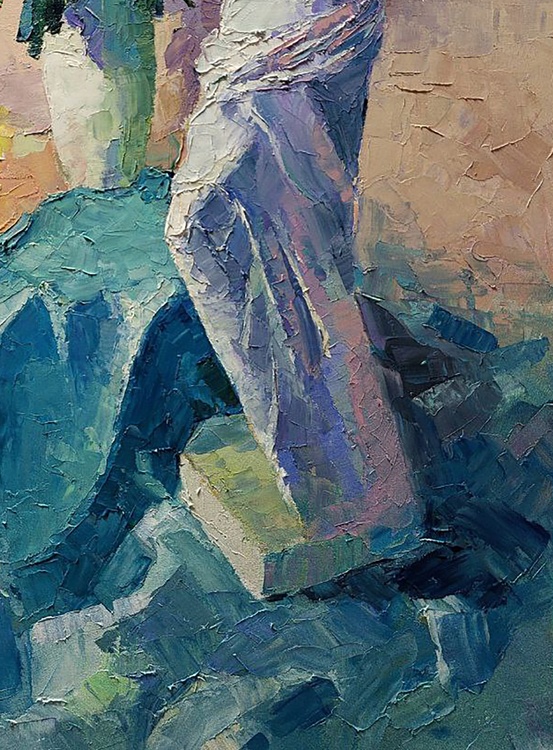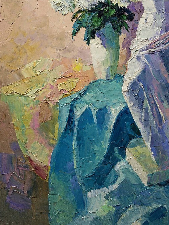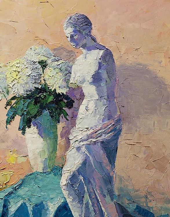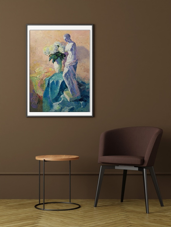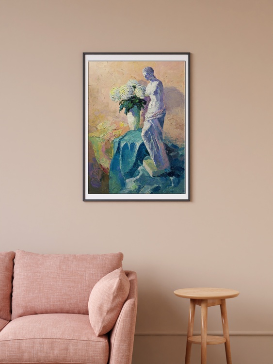 The oil painting titled "Still Life" is a modern take on the traditional still life genre, showcasing a sculptural composition that breathes life into the inanimate. The artwork features a classical statue of a female figure, depicted with a sense of grace and fluidity, as if captured in a moment of contemplation. The statue is rendered in cool tones of blue and white, suggesting the marble or stone from which it might have been carved. Its form is accentuated by the play of light and shadow, highlighting the delicate details of the figure's draped clothing and the gentle curvature of her form. Surrounding the figure is a bountiful arrangement of white chrysanthemums, their full, rounded blossoms providing a textural contrast to the smooth surfaces of the sculpture. The flowers are painted with a lively touch, their petals seemingly in motion, adding a dynamic and organic element to the composition. The background is executed in soft, warm tones of beige and peach, providing a neutral canvas that allows the statue and flowers to stand out. The subtle shifts in color create a sense of depth and warmth, enveloping the central subjects in a gentle embrace. The juxtaposition of the classical figure with the vibrant, living flowers creates a dialogue between the eternal and the ephemeral, between art and nature. The title "Still Life" traditionally refers to a painting of inanimate objects, but here, it takes on a new meaning, as the stillness of the sculpture is paired with the living beauty of the flowers, suggesting a stillness that is full of life. The artist has employed a bold, impasto technique, with thick applications of paint that give the work a rich texture and a sense of immediacy. This technique adds to the vibrancy of the chrysanthemums and the tactile quality of the statue's drapery. The painting's composition is balanced and harmonious, with the statue providing a vertical anchor around which the flowers seem to burst forth. The artist’s signature is subtly incorporated, allowing the interplay of form, color, and texture to convey the essence of the still life. 1045