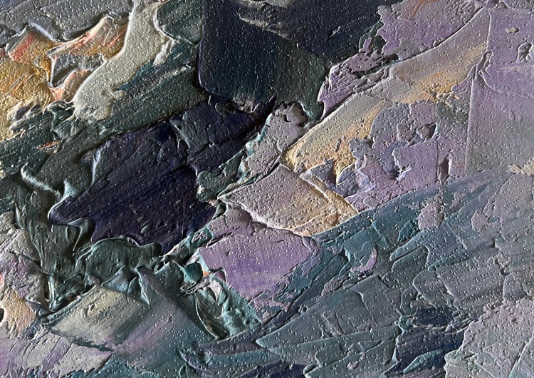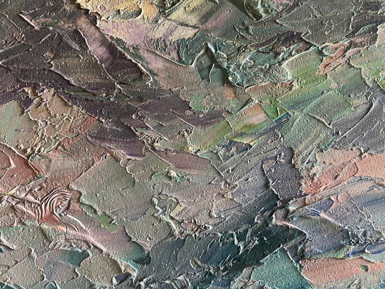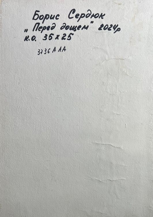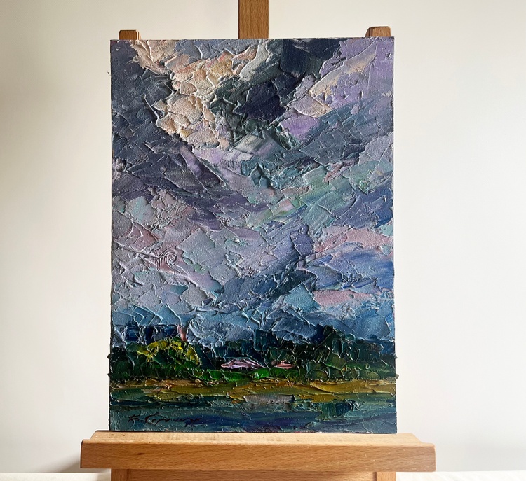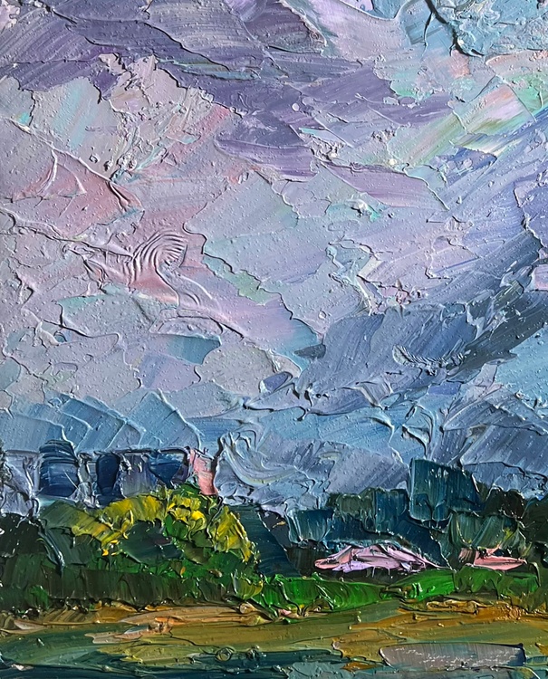 The oil painting on cardboard, titled "Before the Rain", masterfully captures the tension and anticipation in the atmosphere just moments before a summer downpour. The artist uses thick, expressive brushstrokes and a rich impasto technique to create a dramatic sky filled with swirling clouds in shades of blue, gray, lilac, and soft pink. The sky dominates the composition, conveying movement and depth as the storm gathers.The lower portion of the painting presents a peaceful rural landscape, contrasting with the turbulent sky above. A small cluster of houses with muted pink rooftops is nestled among dense green foliage. The buildings appear calm and untouched by the impending storm, creating a striking juxtaposition between the land and sky. In the distance, a subtle touch of golden light highlights the tops of the trees, hinting at the last rays of sunlight before the rain arrives.The use of color in the clouds is particularly striking. The artist blends cool blues with warm purples and soft peach tones, suggesting the complex interplay of light and moisture in the atmosphere. The clouds, painted with heavy, almost sculptural strokes, seem to shift and swirl, reinforcing the feeling of an approaching storm.The foreground features a stretch of land painted in earthy greens and browns, grounding the composition and leading the viewer’s eye toward the distant village. The horizontal lines of the landscape contrast with the vertical energy of the sky, further emphasizing the feeling of an impending change in weather.Through "Before the Rain", the artist conveys the beauty and power of nature’s cycles. The painting captures the fragile balance between calm and storm, between stillness and movement. The village, small beneath the vast sky, serves as a reminder of human vulnerability in the face of natural forces. Yet, there is no sense of fear—only quiet anticipation, as if the landscape itself is holding its breath before the first raindrop falls. 3736
