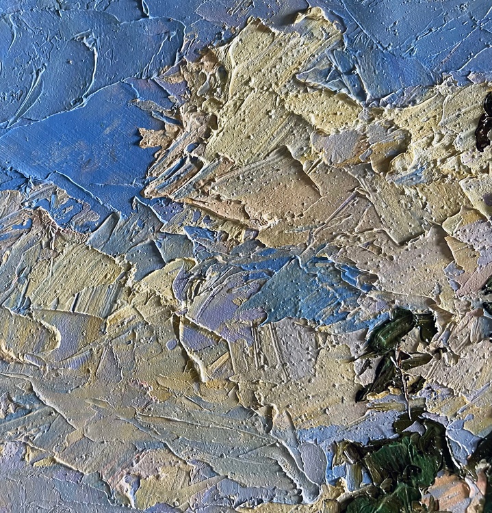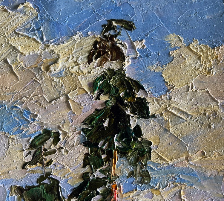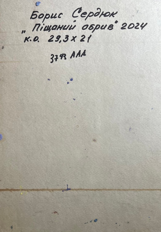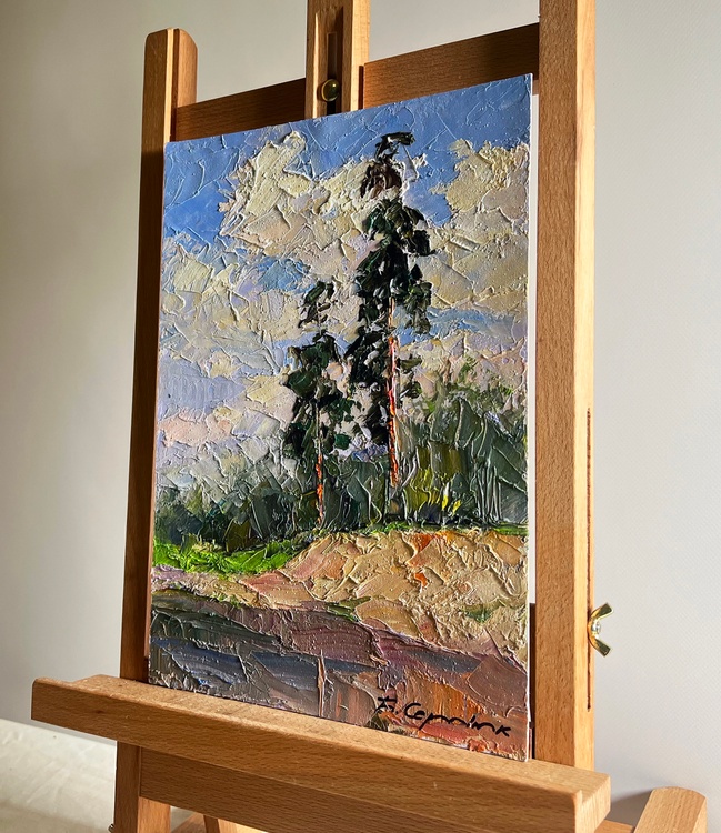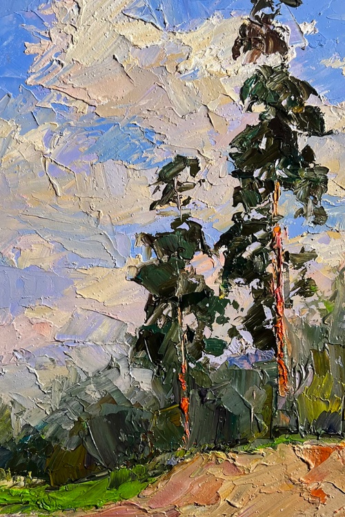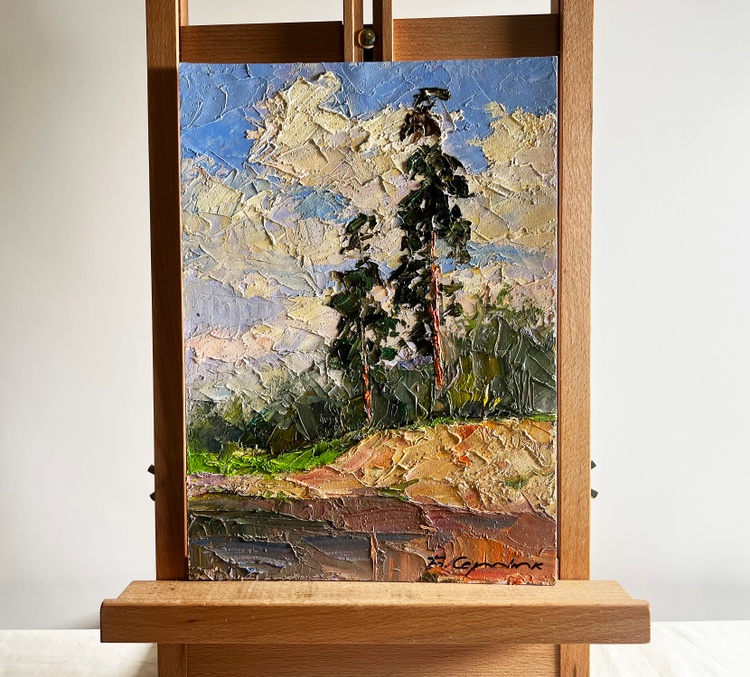 The oil painting on cardboard, titled "Sand Cliff by the River", captures the quiet grandeur of a natural landscape where towering pine trees stand tall against a vast, cloud-filled sky. The artist uses thick, expressive brushstrokes and a rich impasto technique to bring texture and depth to the scene, making every element—earth, water, and sky—feel alive and dynamic.In the foreground, the sandy cliff is depicted in warm earthy tones of ochre, beige, and soft browns, with hints of green vegetation growing along its edges. The brushwork here is bold and textured, emphasizing the rough, uneven surface of the eroded land. The river below, though only partially visible, reflects the surroundings with smooth, dark strokes, contrasting with the textured cliffside.Two tall pine trees rise above the landscape, their slender trunks painted in warm reddish-brown tones that stand out against the cooler greens and blues of the background. The artist captures the light hitting the bark, giving the trees a sense of warmth and life. Their branches, painted with deep green and black tones, sway gently, suggesting movement and the presence of a light breeze.The background consists of a dense forest painted in subdued greens and grays, fading into the distance, creating a sense of depth. Above, the sky is a blend of soft blues, whites, and warm golden hues, with large, billowing clouds stretching across the canvas. The artist's dynamic brushstrokes give the impression of shifting light and an ever-changing atmosphere.Through "Sand Cliff by the River", the artist conveys a sense of stillness and timelessness, celebrating the quiet beauty of untouched nature. The towering pines symbolize strength and resilience, standing firm on the edge of the eroded cliff, much like nature’s ability to adapt and endure. The warm sunlight filtering through the clouds and trees suggests a moment of reflection, inviting the viewer to pause and appreciate the simplicity and grandeur of the natural world. The painting is not just a depiction of a landscape but an invitation to experience the tranquility and power of nature 3743