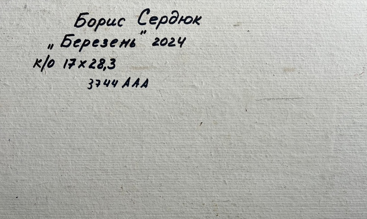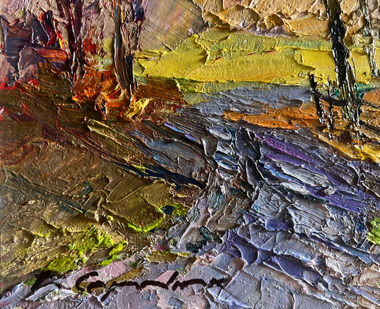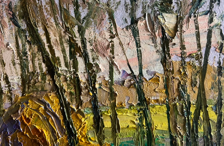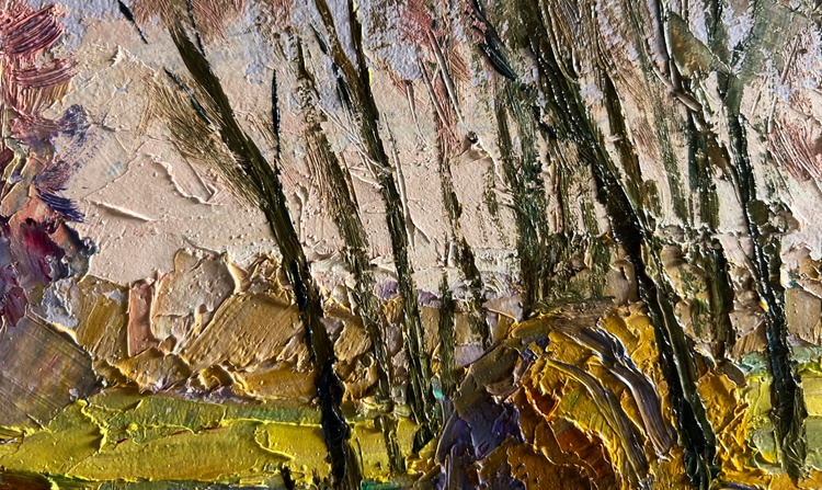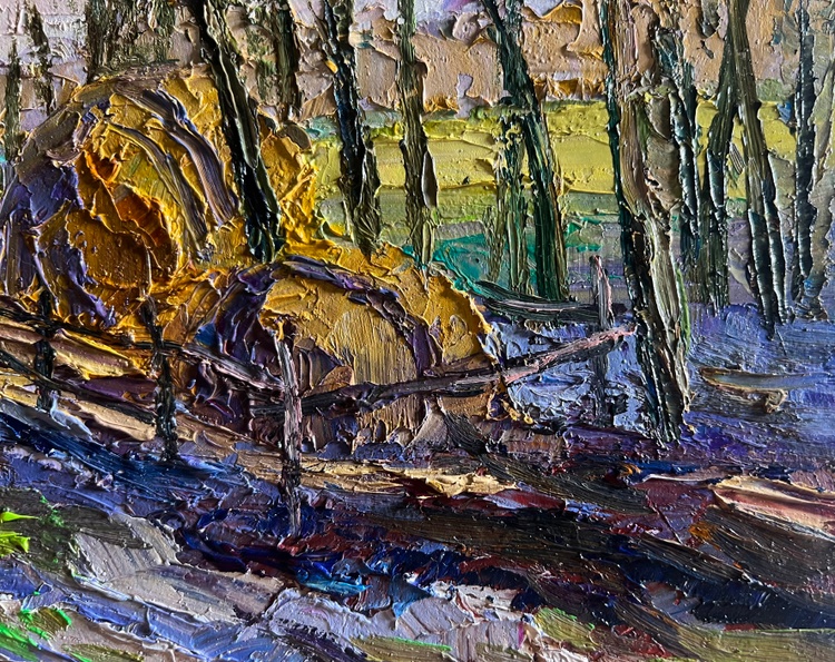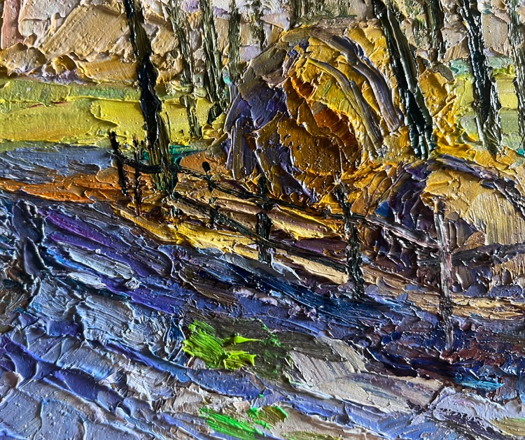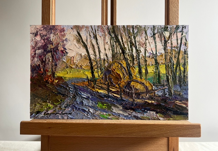 The oil painting on cardboard, titled "March Days in the Field", captures the transition from winter to spring, where the landscape awakens with the first warm rays of the sun. The artist employs bold, textured brushstrokes and a rich impasto technique to create depth and movement, making the scene feel both dynamic and full of life. The composition guides the viewer’s eye along a narrow, thawing path, past a rustic wooden fence enclosing a golden haystack, and into the distant, sunlit fields.The foreground is dominated by cool tones of deep blues, purples, and grays, depicting the melting snow and damp ground as winter releases its hold. The rough texture of the brushwork enhances the impression of uneven, muddy terrain, where patches of green grass begin to emerge. The winding path, painted with strokes of blue and gray, suggests the softness of the earth as it absorbs the melting snow.In the middle ground, the golden haystack stands as a warm focal point, enclosed by a simple wooden fence. The artist uses thick layers of ochre, yellow, and burnt sienna to convey the texture of dried grass, which contrasts beautifully with the cooler tones of the surrounding landscape. The presence of the haystack hints at rural life, agricultural traditions, and the slow but steady preparation for the coming season.The background features slender, bare trees stretching toward the sky, their dark branches forming an intricate network of lines against the soft, pastel-colored sky. Their sparse foliage indicates the last days of winter, while the warm hues of the fields beyond suggest the promise of spring. The sky, painted in a delicate mix of lavender, pale pink, and soft blue, reflects the gentle light of an early March day, where the cold still lingers, yet warmth is on the horizon.Through "March Days in the Field", the artist conveys a sense of seasonal change, renewal, and quiet rural beauty. The painting evokes the contrast between the remnants of winter and the first signs of spring, highlighting the resilience of nature and the anticipation of growth. The rustic setting, combined with the atmospheric light and color contrasts, invites the viewer to experience the simple yet profound beauty of this transitional moment in time. 3744