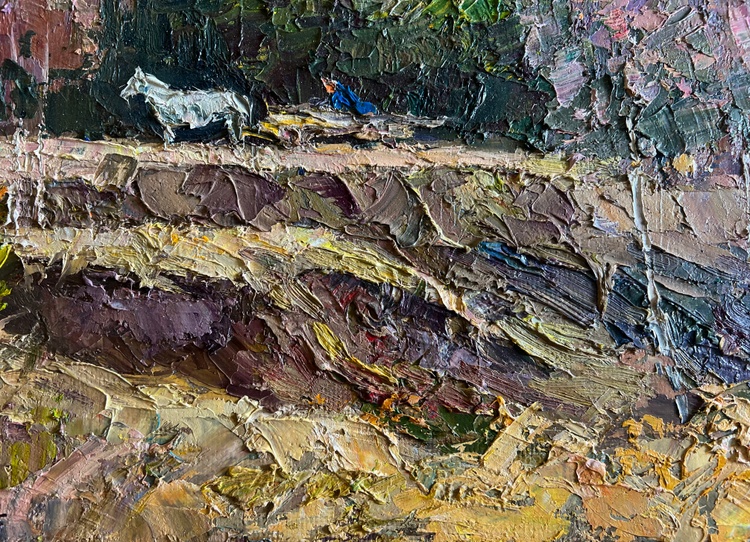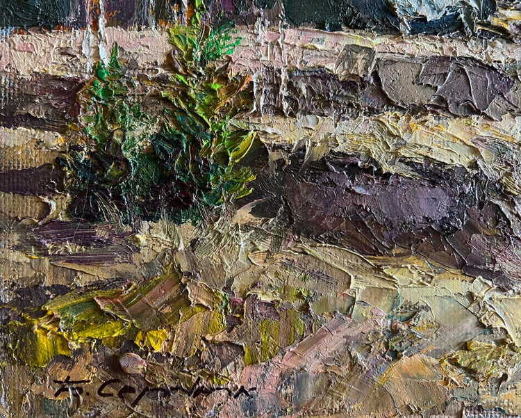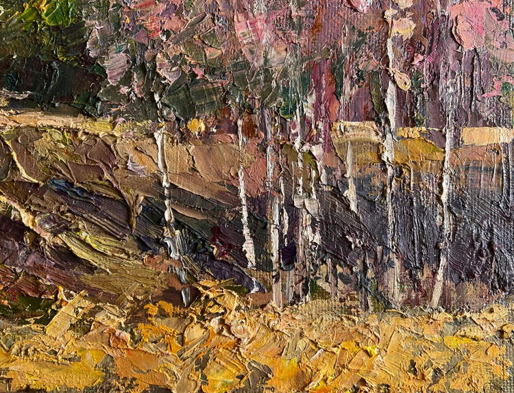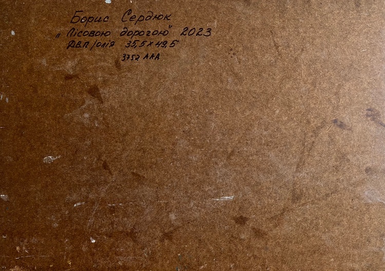 The oil painting on cardboard, titled "Along the Forest Road", captures a serene autumn landscape where nature and rural life merge harmoniously. The artist employs thick, textured brushstrokes and a warm, earthy palette to create depth and movement, bringing the viewer into a quiet, picturesque moment in the countryside. The scene is framed by a variety of trees, their leaves painted in shades of soft pinks, oranges, and muted browns, suggesting the peak of autumn before the arrival of winter.In the foreground, the rugged terrain is depicted with bold strokes of ochre, gold, and deep browns, illustrating a winding dirt road carved into the hillside. The textured application of paint gives the ground a rich, tactile quality, emphasizing the rough yet natural beauty of the land. Small patches of green vegetation still cling to the landscape, hinting at the transition between seasons.At the center of the composition, a white horse pulls a simple wooden cart, where a solitary figure, dressed in deep blue, sits in quiet contemplation. The horse, painted with smooth yet expressive strokes, moves at a leisurely pace, adding to the overall feeling of calm and simplicity. The presence of the cart suggests daily rural labor, travel between villages, or perhaps a peaceful journey through familiar land.Beyond the road, a dense forest in the background is painted in a deep mix of greens and browns, contrasting with the lighter, more delicate colors of the foreground trees. The sky, filled with soft blues and pale cloud formations, stretches across the top of the painting, giving the scene an airy openness. The scattered clouds diffuse the sunlight, casting a gentle, golden glow over the landscape.Through "Along the Forest Road", the artist conveys a sense of nostalgia, solitude, and appreciation for the quiet rhythm of rural life. The painting evokes the beauty of the changing seasons and the connection between people and the land. The gentle motion of the horse and cart, the rustling autumn leaves, and the vast openness of the natural surroundings invite the viewer to pause and reflect on the simplicity and peace of life away from the fast pace of modern civilization. 3752
