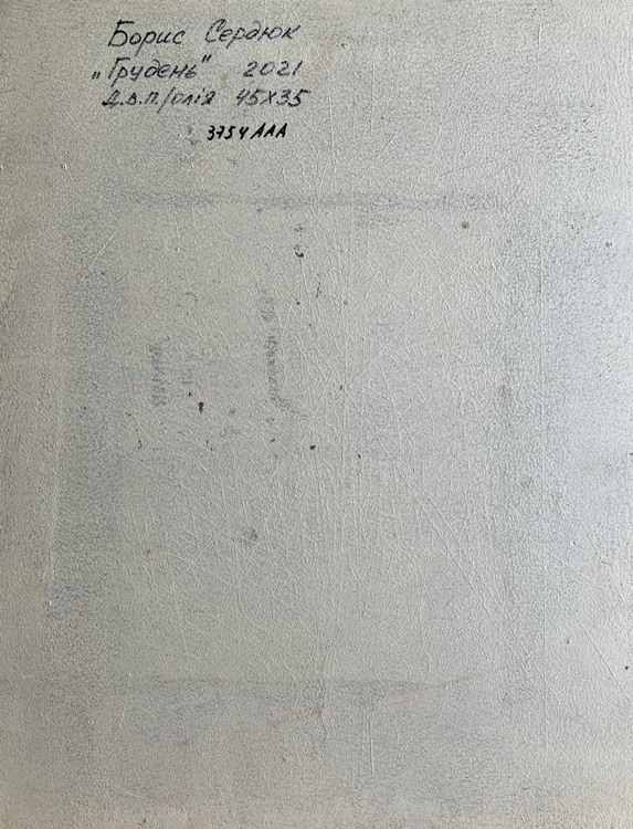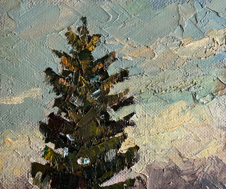 The oil painting on cardboard, titled "A Cold December Day", captures the quiet stillness of winter in a rural village. The artist employs thick, expressive brushstrokes and a textured impasto technique to create depth and atmosphere, making the scene feel both crisp and inviting. The soft interplay of light and shadow enhances the sense of coldness, while the subdued colors reflect the muted beauty of a winter landscape.In the foreground, patches of snow blanket the ground, painted with cool blues and whites that suggest both the softness of freshly fallen snow and the hardness of icy terrain. Shadows stretch across the surface, cast by the bare branches of a leafless tree, adding to the composition’s sense of depth. The wooden fence, painted in warm browns and ochres, contrasts with the cold tones of the snow, providing a sense of enclosure and rustic charm.The middle ground features two weathered wooden houses, their roofs dusted with snow. The artist skillfully renders the texture of the aged wood, emphasizing the passage of time. The houses, nestled together, convey a sense of warmth and shelter despite the harsh winter surroundings. The simple, unadorned structures hint at the quiet resilience of village life, where people endure the long, cold months with patience and familiarity.A tall evergreen tree stands in the background, its dark green foliage offering a striking contrast against the pale sky. It serves as a visual anchor in the painting, symbolizing endurance and the steady presence of nature even in the coldest season. Behind the tree, a distant forest, painted in soft purples and grays, fades into the winter haze, reinforcing the vastness and stillness of the landscape.The sky is a delicate mixture of pale blues, warm yellows, and soft pinks, suggesting the subtle glow of a winter sun hidden behind thin clouds. The artist’s use of light creates a subdued yet comforting atmosphere, as if the day, though cold, holds a quiet beauty.Through "A Cold December Day", the artist conveys a sense of solitude, resilience, and the understated elegance of winter. The painting evokes feelings of nostalgia, reminding the viewer of the peaceful, unhurried pace of village life during the colder months. The contrast between the warmth of the wooden homes and the chill of the snow-covered ground highlights the delicate balance between nature and human habitation, capturing a moment of quiet harmony in the depths of winter. 3754