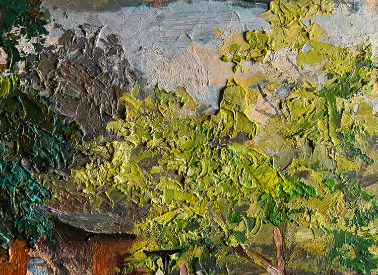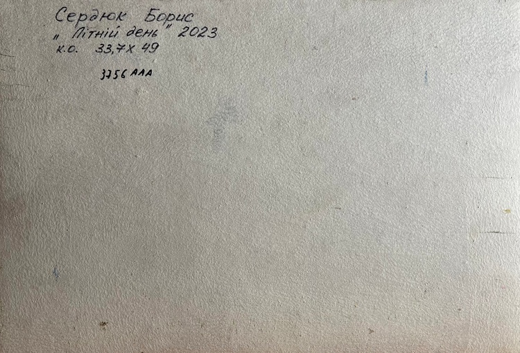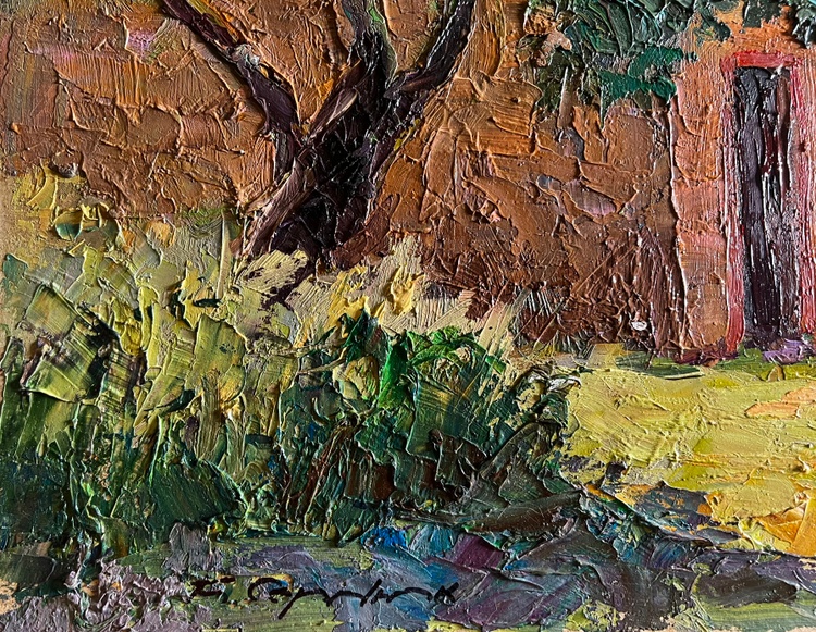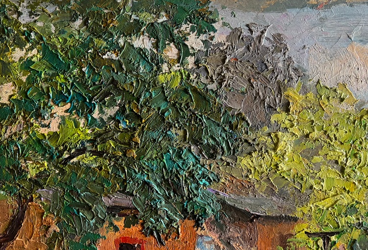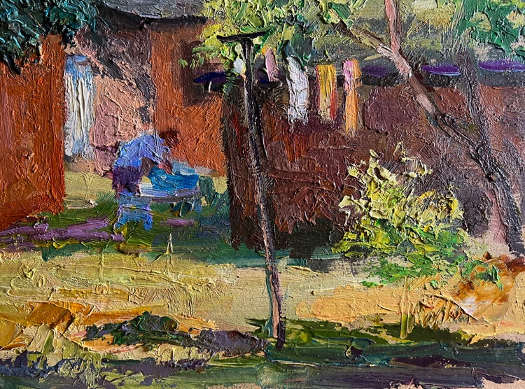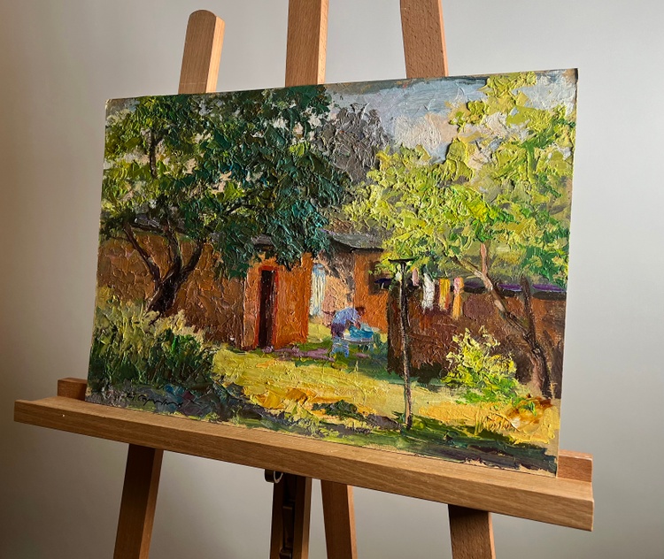 The oil painting on cardboard, titled "Summer Holidays in the Village", captures the warmth, simplicity, and nostalgic charm of rural life. The artist employs thick, expressive brushstrokes and a rich impasto technique to create a vibrant, textured scene filled with dappled sunlight, lush greenery, and the earthy tones of village houses. The composition leads the viewer into a cozy courtyard where a person is engaged in daily chores, evoking a sense of tranquility and connection with nature.The foreground is dominated by patches of bright sunlight and deep shadows, emphasizing the natural movement of light through the trees. The golden grass and sunlit earth contrast with the cool greens of the foliage, enhancing the sense of a warm summer day. The artist’s use of texture in the grass and trees gives the painting a lively, organic feel, making the leaves seem as if they are gently swaying in the breeze.The middle ground features a small village yard enclosed by reddish-brown brick houses, their doors and windows slightly ajar, suggesting daily activity and the presence of life within. The rough, textured walls of the buildings create a sense of age and history, reinforcing the feeling of a well-loved home. A figure, painted in soft blues and purples, is seen working near a table, perhaps washing or preparing food. This small but significant detail adds a human presence, bringing warmth and authenticity to the scene.The background consists of softly blended trees and a pale blue sky with hints of warm yellow, capturing the hazy glow of a summer afternoon. The sky’s subtle gradation of colors enhances the peaceful atmosphere, making the entire composition feel relaxed and inviting.Through "Summer Holidays in the Village", the artist conveys a deep appreciation for the simple joys of rural life—the shade of fruit trees, the warmth of a sunlit courtyard, and the quiet routine of daily chores. The painting evokes a sense of nostalgia, reminding the viewer of childhood summers spent in the countryside, where time moves slowly and the air is filled with the scents of nature. It is a celebration of the beauty found in everyday moments, an invitation to step into the scene and experience the peaceful, sun-drenched serenity of village life. 3756