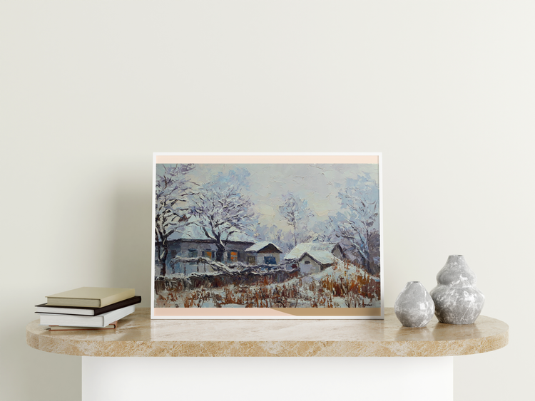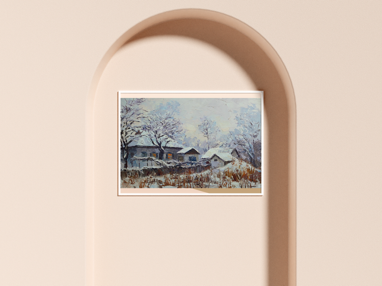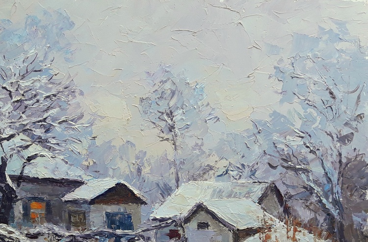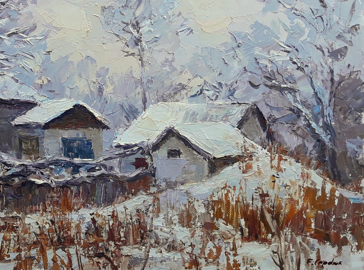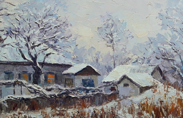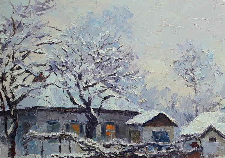 "Winter Evening" by Serdyuk Boris beautifully captures the quiet stillness and serenity of a snowy landscape at dusk. The scene depicts rural homes enveloped in snow, their roofs and fences blending into the surrounding whiteness, while the faint glow from windows hints at warmth and life within. The trees stand bare, their branches laden with snow, emphasizing the depth of winter.The artist uses textured brushstrokes to convey the softness of the snow and the cold air. The contrast between the warm yellow light in the windows and the cool, muted blues of the snow reflects the interplay between nature’s cold and the comfort of home.Through this work, Serdyuk expresses not only the beauty of winter but also a sense of peace, nostalgia, and the comforting solitude that winter evenings evoke. It reminds the viewer of the harmony between the harshness of nature and the warmth found in simple domestic life. 53