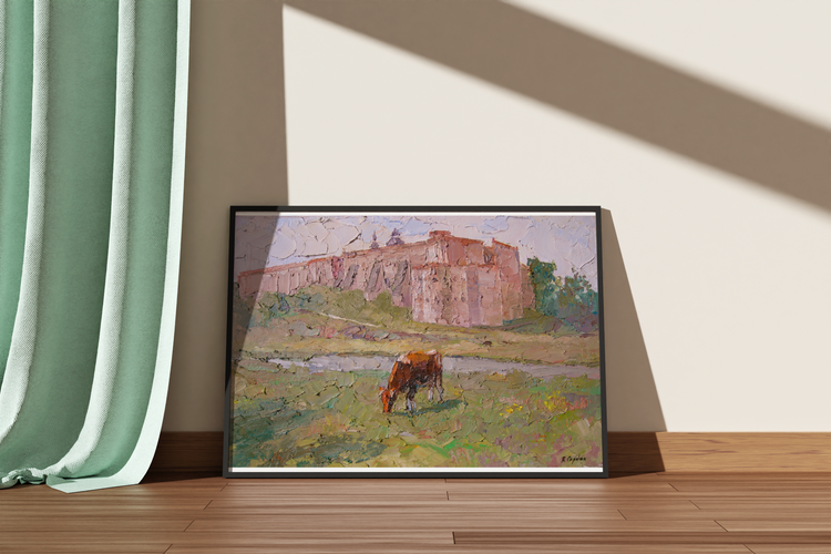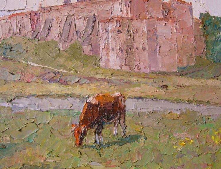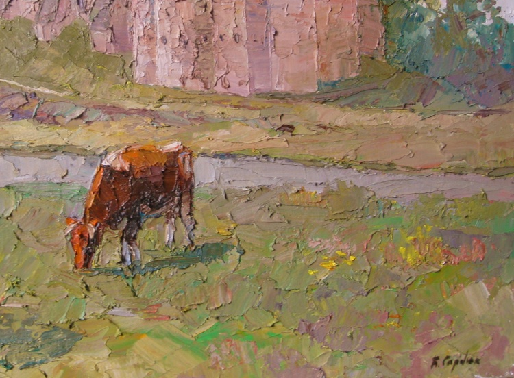This beautiful oil painting captures a summer day on the outskirts of the city. A cow is grazing in the meadow, and the grass is so green and lush. The sky is a deep blue, and there are puffy white clouds. It's just a perfect day. You can almost feel the warmth of the sun and the freshness of the breeze. This painting would be a wonderful addition to any home or office, and it would make a great gift, too. 106