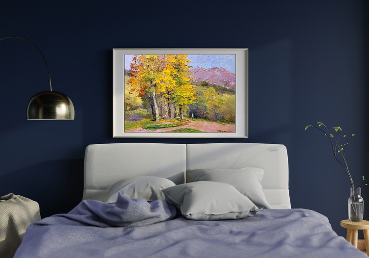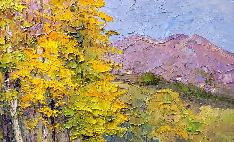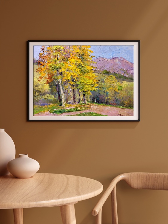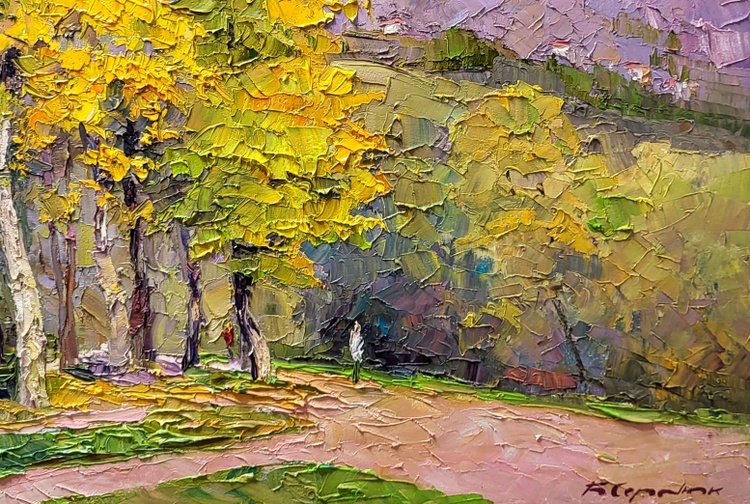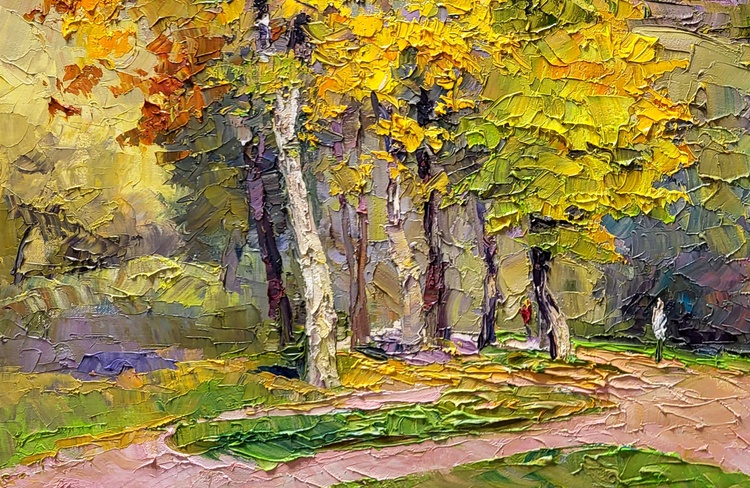 This oil painting, entitled "In the Autumn Park," is a vivid portrayal of the serene and colorful ambiance of a park in the fall. The artist has embraced the impasto technique, applying the paint in thick, textured strokes that give the piece a dynamic and almost tactile quality. Dominating the scene is a magnificent deciduous tree in mid-transition, its leaves a firework display of autumn colors ranging from sun-kissed yellow to fiery orange, interspersed with the remaining hints of summer green. These colors are rendered with palpable energy, each stroke contributing to the sense of a foliage alive with the seasonal shift. Below the tree, the ground is a patchwork of fallen leaves and rich earth, painted in tones that echo the tree's vibrant canopy. This carpet of colors creates a soft bedding over the path and the grass, suggesting the quiet, muffled sound of footsteps that one might experience while walking through a real autumn park. The background is a study in subtlety; muted greens and purples suggest a row of trees in the distance and the silhouette of a distant mountain range under a soft, overcast sky. This backdrop forms a gentle contrast to the vividness of the foreground, providing a sense of depth and tranquility. Through the use of bold textures and a rich palette, "In the Autumn Park" is not merely a visual experience but also an invitation to imagine the crispness of the air, the rustling of leaves, and the serene solitude of an autumnal stroll. The painting captures the essence of the season — its transient beauty, its cool brightness, and the nostalgia that accompanies the turn of summer into fall. 1000