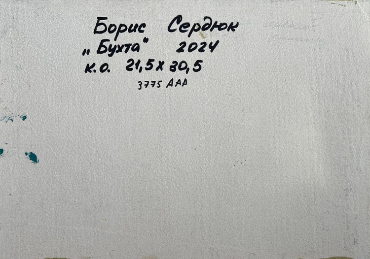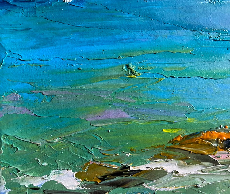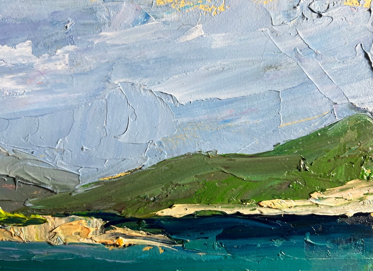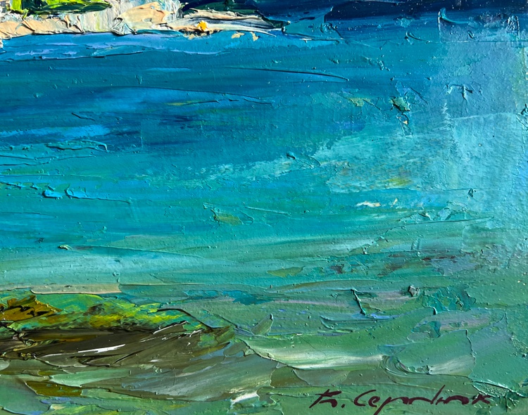 This oil painting cardboard, titled "Sea and mountains", the composition is balanced and expansive, leading the viewer's eye across the calm, turquoise waters to the rocky shoreline and distant mountain peaks. The foreground features the shallow coastal waters, where subtle reflections of sky and vegetation blend into the sea’s dynamic surface. Hints of orange and green suggest underwater rocks or seaweed, adding depth and realism. The middle ground is dominated by the open sea, painted in deep blues, vibrant greens, and shimmering turquoise tones, indicating sunlight playing on the waves. A small white sailboat drifts in the distance, adding a focal point and a sense of scale, reinforcing the vastness of the seascape. The background features a rocky coastline with patches of greenery, transitioning into towering mountains, painted in muted grays and greens, suggesting distance and atmospheric perspective. The sky, filled with dynamic cloud formations in blues, grays, and whites, conveys a sense of movement and shifting weather. The composition creates a sense of freedom and open space, evoking the feeling of standing at the shore, gazing toward the horizon. The water is depicted with smooth yet textured strokes, capturing the fluidity and shimmer of the sea’s surface. The sky is rendered with broad, sweeping strokes, conveying the soft movement of clouds drifting above the mountains. The mountains and rocky shore feature strong, defined brushstrokes, emphasizing their rugged, solid nature. The foreground elements, such as underwater rocks, are painted with rich texture, creating depth and inviting the viewer into the scene. This bold and confident brushwork gives the painting a sense of spontaneity and energy, perfectly mirroring the natural forces of wind, water, and land. The open sea and distant mountains create a feeling of endless exploration and peaceful escape. The single sailboat adds a narrative element, suggesting a quiet journey across the water. The artist’s signature appears in the lower right corner, subtly blending with the sea’s cool tones. The painting follows an impressionistic style, focusing on light, color, and movement rather than precise detail. The textured impasto application, vibrant color contrasts, and expressive brushwork make this painting a visually captivating and emotionally engaging seascape. 3775