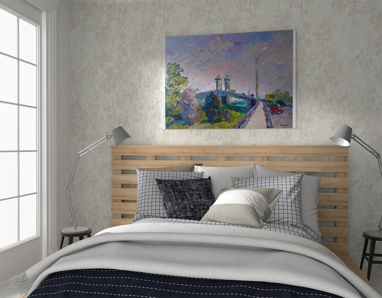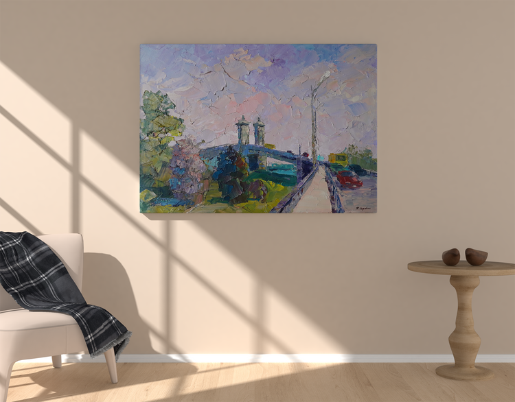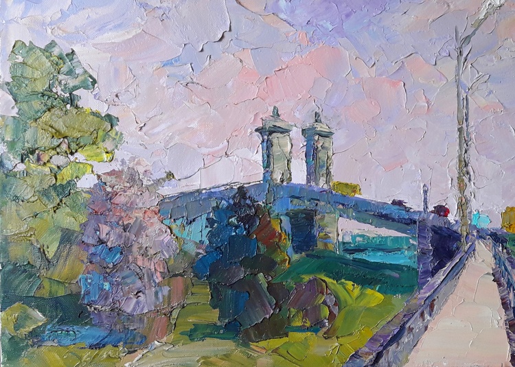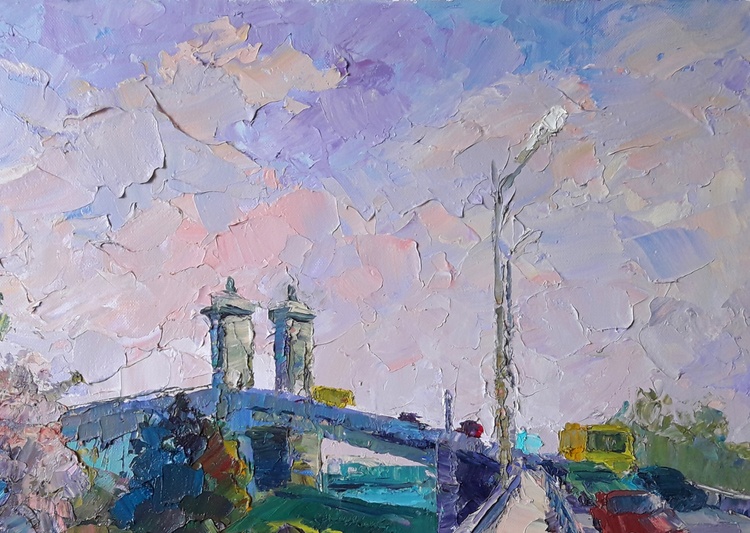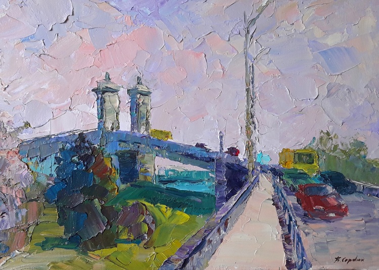 "Bridge across the Dnieper" by Boris Serdyuk captures a vibrant scene of urban life on a bridge spanning the great Dnieper River. Through expressive, textured brushstrokes and soft pastel tones, the artist brings to life the movement and interaction between the natural and built environments.The painting features vehicles and pedestrians crossing the bridge, symbolizing connectivity and the rhythm of everyday life. The use of pink, blue, and green tones reflects a serene and harmonious atmosphere, perhaps capturing the moments of transition during dawn or dusk.Serdyuk may have intended to express the bridge as not only a physical crossing but also a metaphor for unity, movement, and progress—qualities that resonate with the flow of life along the riverbanks of the Dnieper. The interplay of colors between sky, river, and infrastructure conveys a sense of calm amid the bustle, inviting viewers to appreciate the beauty within the mundane moments of a city’s life. 185