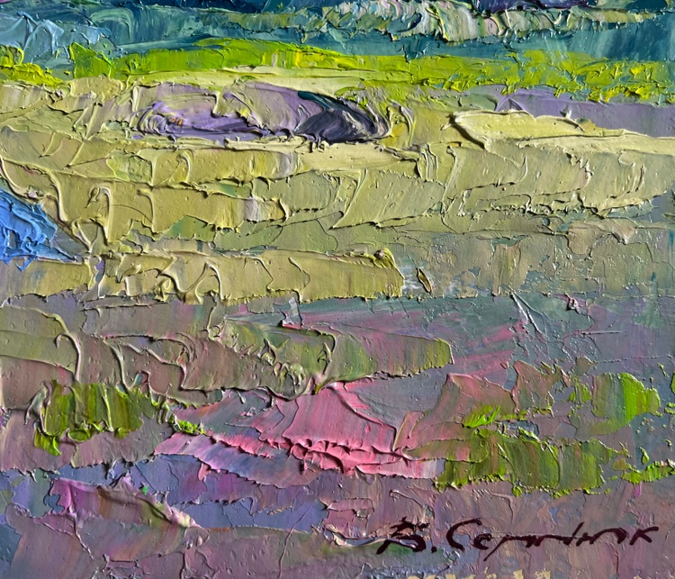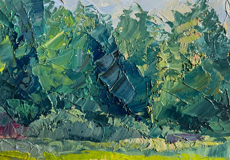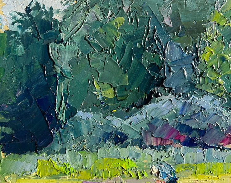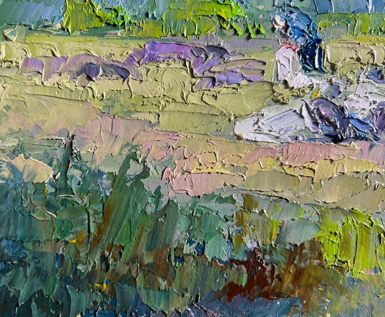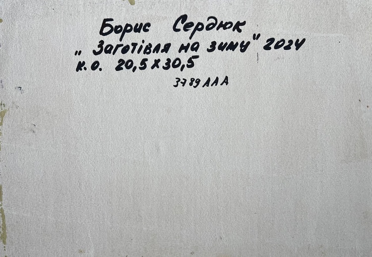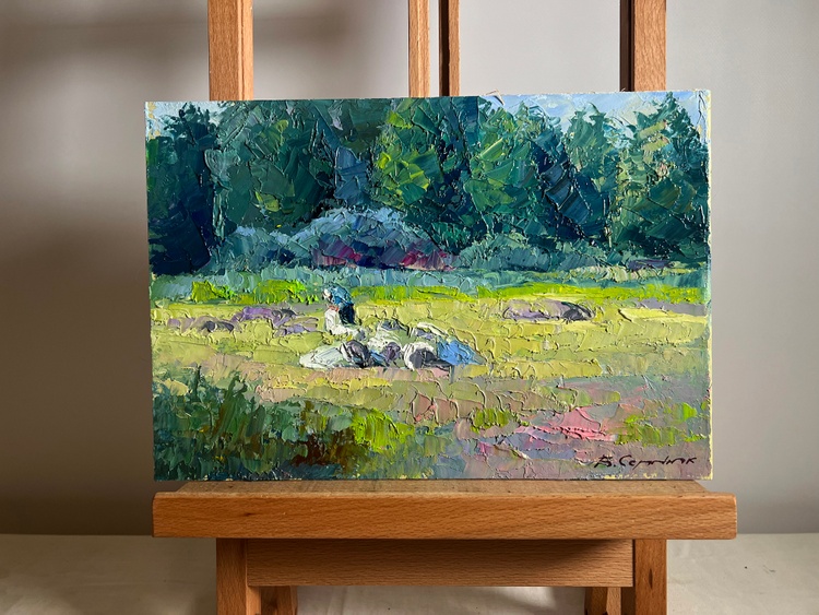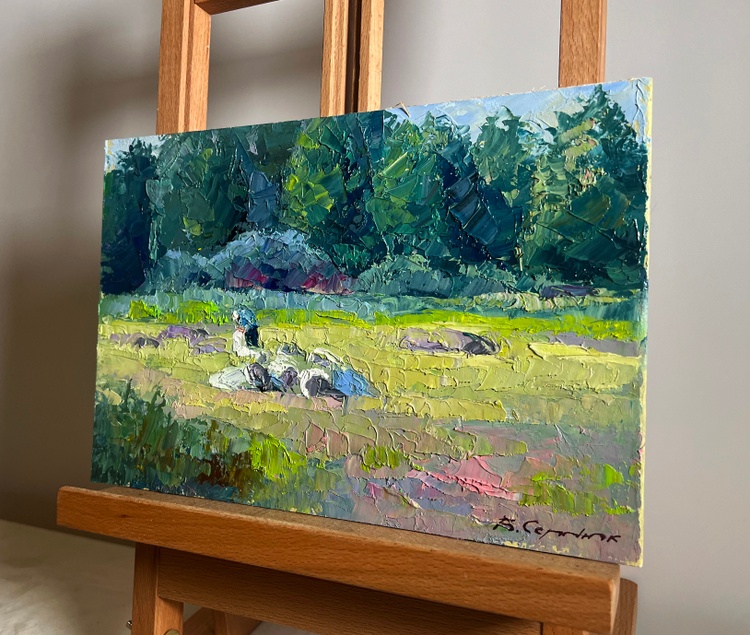 This oil painting cardboard, titled "Preparing for winter", the composition is balanced and draws the viewer’s attention to the central figure—a person engaged in work, surrounded by a small group of animals, possibly sheep or goats, resting in the sunlit field. The presence of these elements suggests a traditional countryside setting, where farmers prepare for the colder months by gathering resources, tending to livestock, or completing seasonal tasks. The foreground is filled with soft, golden grass, punctuated by scattered rocks and patches of greenery. This gradually leads the eye toward the middle ground, where the figure and animals are positioned, adding depth and a sense of human presence. The background consists of a dense forest of evergreen trees, their dark green tones contrasting with the lighter hues of the sunlit field. A rocky outcrop among the trees adds further texture and variation to the composition. The painting is dominated by natural, warm tones that suggest the late summer or early autumn season, a time when rural communities traditionally prepare for winter. The golden grass, painted with variations of yellow, ochre, and light green, appears illuminated by the soft, diffused sunlight. Hints of purple and pink in the grass add subtle complexity, enhancing the richness of the landscape. The cool greens and blues of the trees in the background provide a strong contrast, reinforcing the feeling of depth and space. The artist captures the dappled light filtering through the trees, adding vibrancy to the scene. Shadows are softly blended, suggesting a calm, warm day with a gentle breeze moving through the landscape. The person in the scene is painted with loose yet intentional strokes, emphasizing movement and work rather than fine detail. The animals, rendered with soft, rounded brushstrokes, appear at rest, adding a sense of tranquility to the overall composition. The texture of the rocks is captured through bold, rough strokes, giving them a rugged, natural appearance. The choice of colors, the balance between warm and cool tones, and the expressive brushwork all contribute to a sense of nostalgia and appreciation for nature’s rhythms. The painting invites the viewer to pause and reflect on the beauty of simple, essential tasks—gathering, tending, and preparing for the colder months ahead. 3789