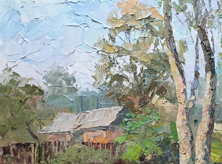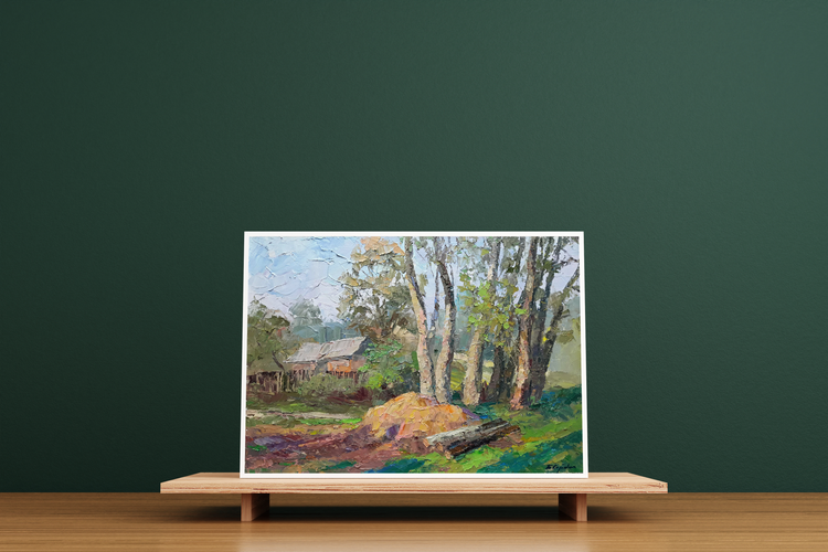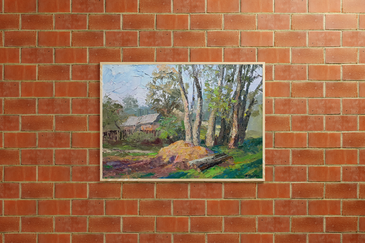 In the poplar is an oil painting that depicts old poplars, a village house behind them, and a forest in the distance. It has a wide range of colors, from the bright greens of the leaves to the deep browns of the tree trunks. The painter has used light and shadow to create a sense of depth and movement. The brushwork is impressively detailed.This painting would make a great addition to any home. It would be perfect for a living room or bedroom. The warm colors and peaceful scene would create a calming atmosphere. The painting is unsigned, but it is a beautifully executed piece that would be sure to please anyone who sees it. 276