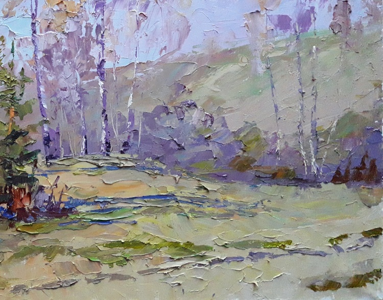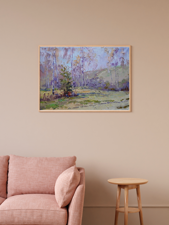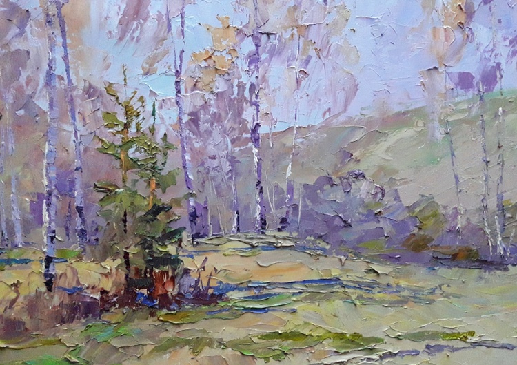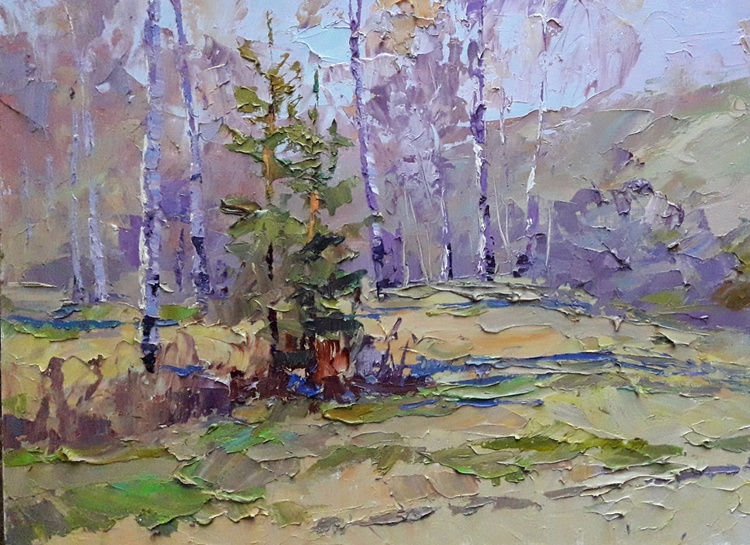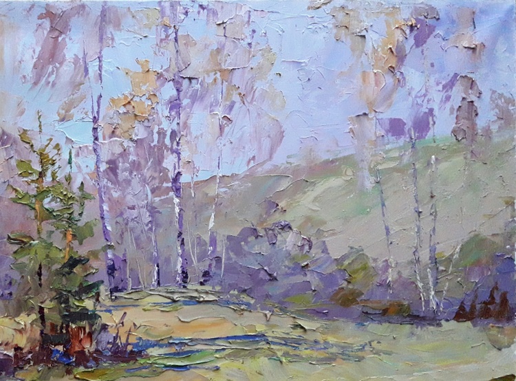 "Spring Forest" by Boris Serdyuk captures the delicate transformation of nature as winter gives way to spring. The painting showcases a peaceful forest scene, where birch trees rise gracefully against soft, pastel-colored hills. At the center, young greenery emerges, symbolizing new life and renewal.Serdyuk's use of light purple and blue hues evokes a calm atmosphere, highlighting the coolness that still lingers in the early spring air. The subtle play of light across the landscape reflects the shift in seasons, bringing a sense of hope and awakening. Through this work, the artist expresses the beauty of nature's quiet rebirth, inviting the viewer to pause and appreciate the fleeting moments of early spring. 297