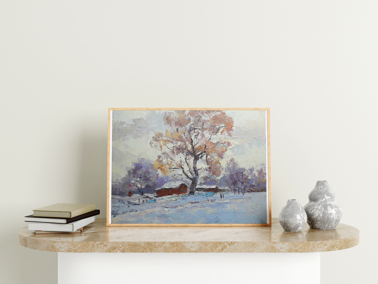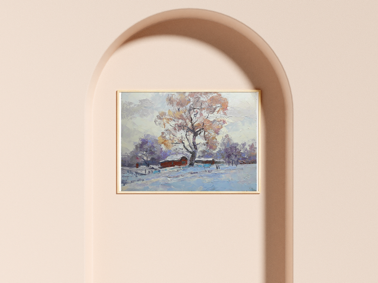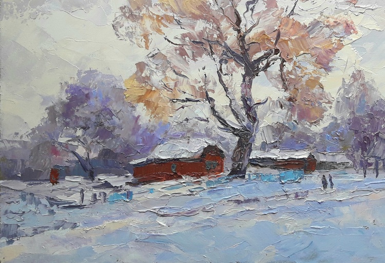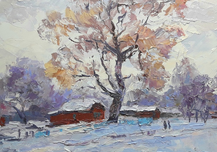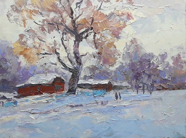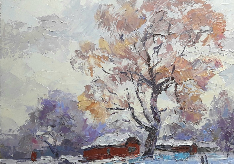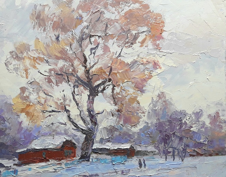 "Winter Street" by Boris Serdyuk captures the serene and nostalgic beauty of a snowy winter scene. In this painting, a large tree with autumn's lingering leaves stands prominently, symbolizing resilience and transition between seasons. The red-toned houses, nestled under layers of snow, contrast with the cool blues and purples of the snowy landscape, adding warmth to the composition. Serdyuk's expressive brushstrokes convey the quiet stillness of a winter day, with soft textures and pastel tones creating an atmosphere of calm. The figures in the distance add a sense of life, but the focus remains on the harmony between nature and human habitation. Through this work, the artist reflects the charm of everyday life in winter, evoking both nostalgia and a connection to the simplicity and beauty found in nature during the cold season. 336