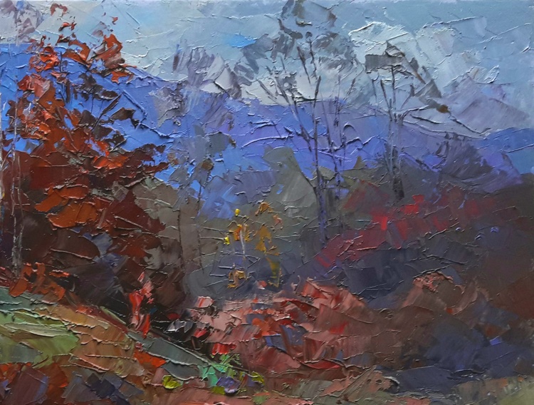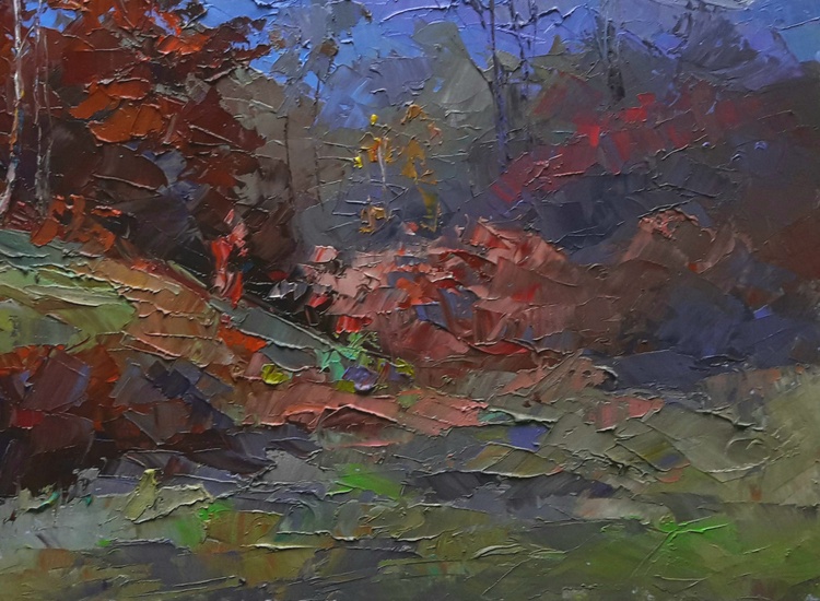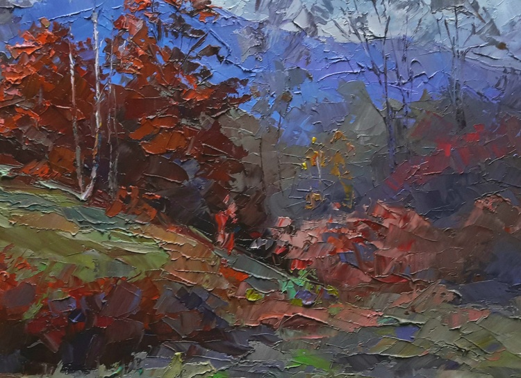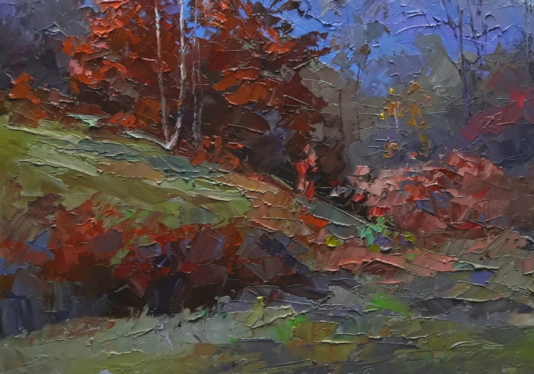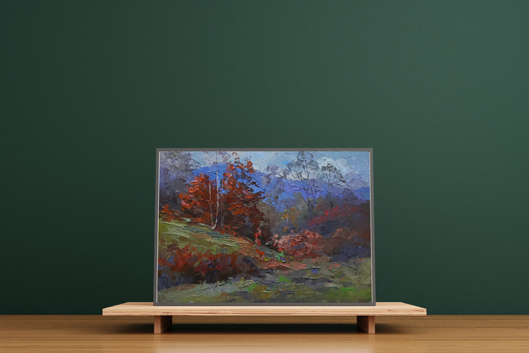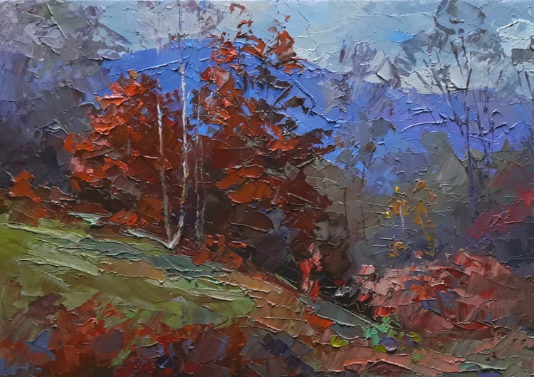 Welcome to "Burning autumn", our brilliant oil painting that celebrates the spectacular colors of the season. This painting features hills, meadows, and an autumn forest, all bathed in a beautiful crimson light. The distant mountains provide a stunning backdrop for the scene, and the overall effect is simply stunning. This painting would make a great addition to any home or office, and would be sure to engage and delight anyone who sees it. It's perfect for anyone who loves the fall season, or for anyone who appreciates beautiful art. Order now and enjoy the beauty of "Burning autumn" for many years to come! 438