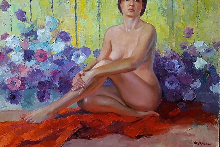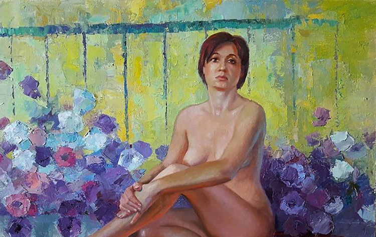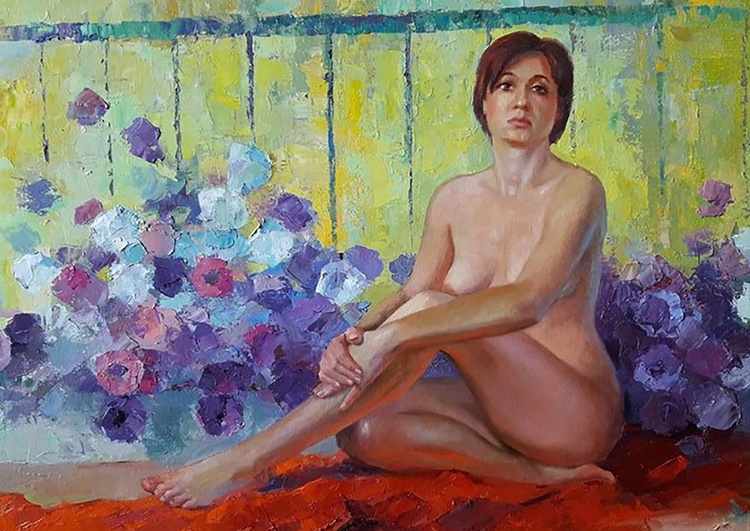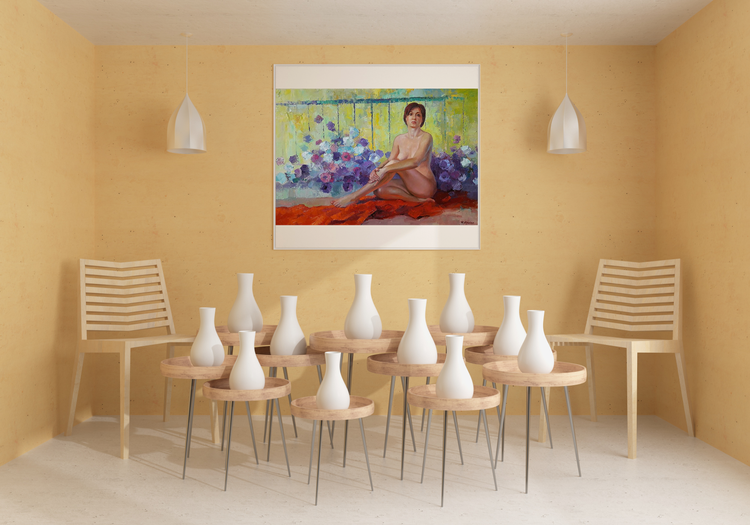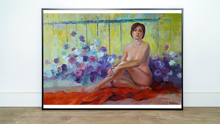 This beautiful oil painting captures the graceful figure of a nude woman, set against a backdrop of blue petunias. The woman's body is slightly turned, and her head is bowed in thoughtfulness, making the painting both elegant and intriguing. The artist has masterfully used light and shadow to create a sense of depth and dimension, and the colorful petunias add a touch of playful charm. This painting would make a stunning addition to any home or office, and is sure to be a conversation starter. 447