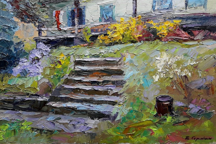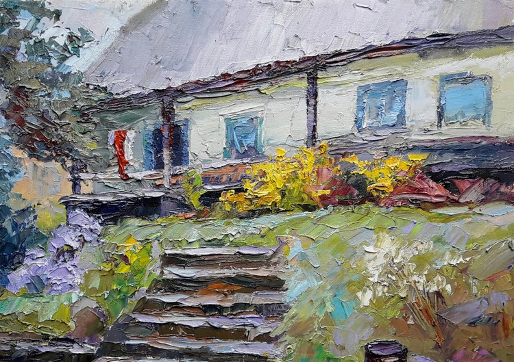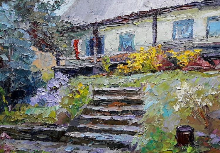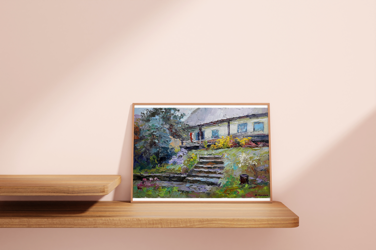 Introducing "In Transcarpathia", an oil painting that captures the essence of a village house in the Transcarpathian region of Ukraine. Painted in traditional Ukrainian national colors, the house is surrounded by trees and set against a backdrop of rolling hills. The painting is sure to bring a touch of flavor and charm to any home. 355