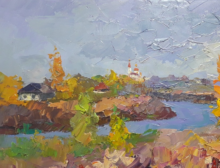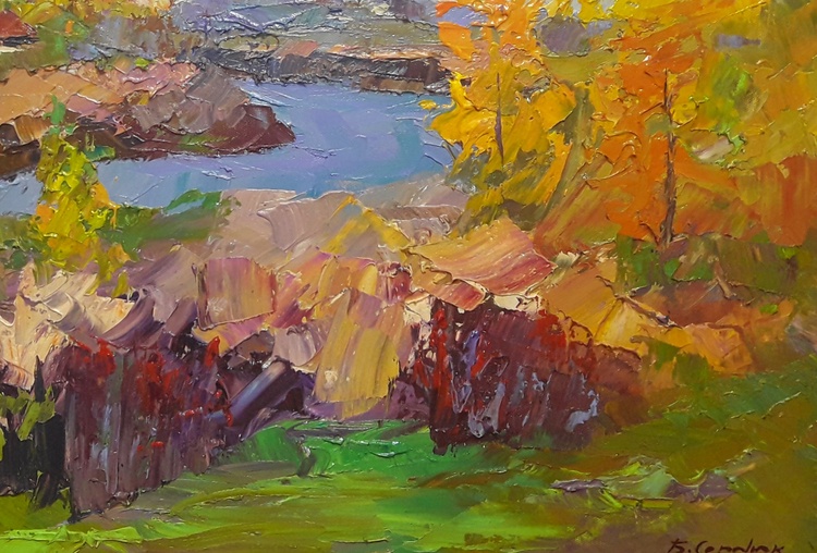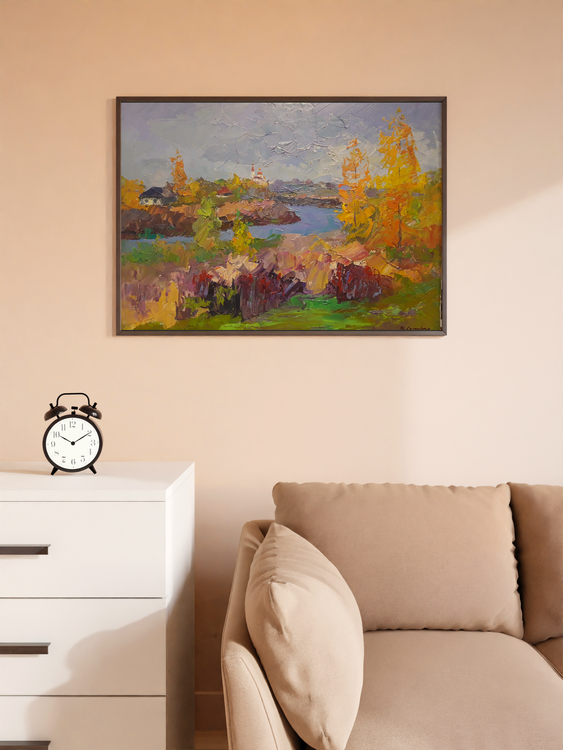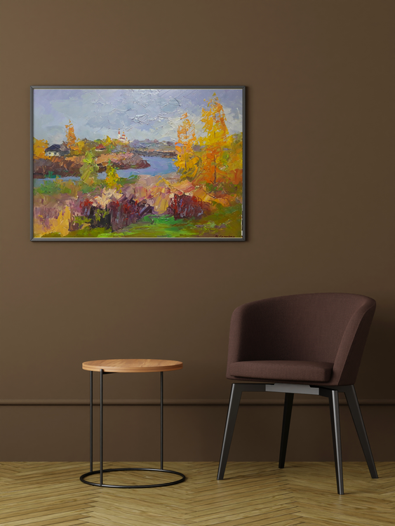 This stunning oil painting is the perfect way to bring the beauty of autumn into your home. The rich, colorful leaves of the trees and the peaceful river scene create a sense of relaxation and calm. The detail in the house in the background adds a touch of warmth and charm. This painting is sure to be a conversation starter and become a treasured family heirloom. 525