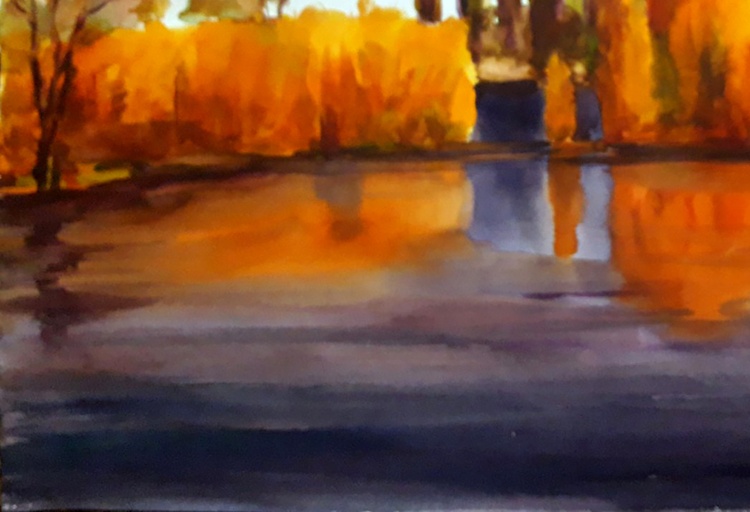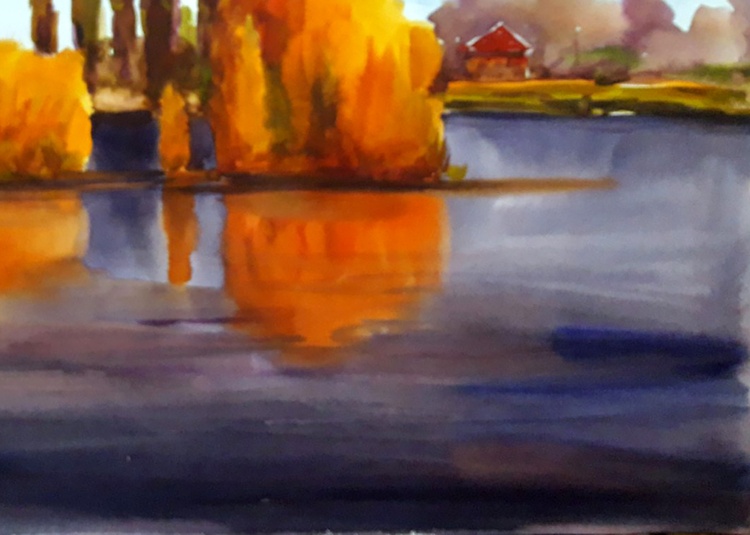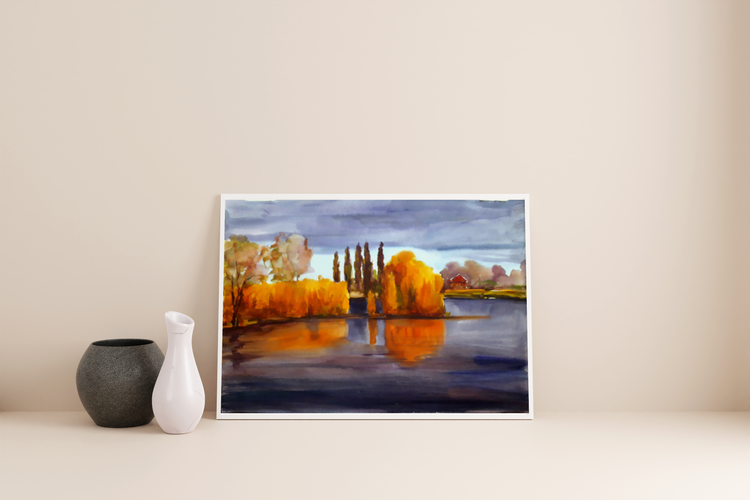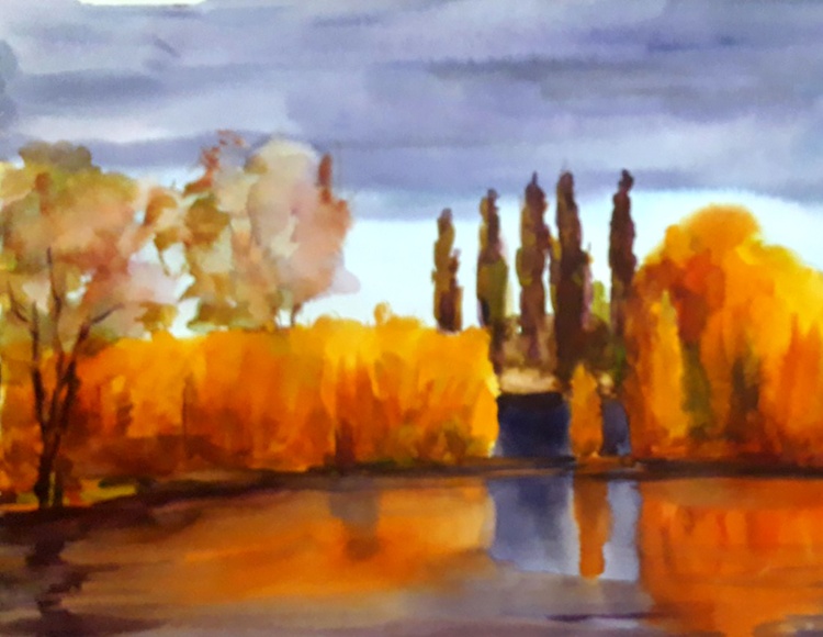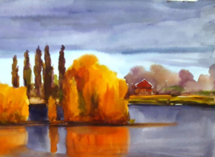 "River Surface" by the renowned Ukrainian artist Serdyuk Boris is a luminous watercolor that captures the tranquil majesty of autumn reflected in still waters. Bold golden and orange foliage contrasts with the deep blues and violets of the sky and river, creating a vibrant mirror effect that dominates the composition. The vertical rhythm of the trees and their reflections draws the viewer’s eye inward, while the solitary house on the far bank adds a sense of quiet rural life. Despite the dramatic sky, there is no tension—only calm, silence, and reverence for nature. Through this painting, Serdyuk conveys a deep appreciation for seasonal beauty and the fleeting harmony of a moment captured between light and water. It’s a peaceful homage to nature’s elegance and the stillness that invites reflection. 604