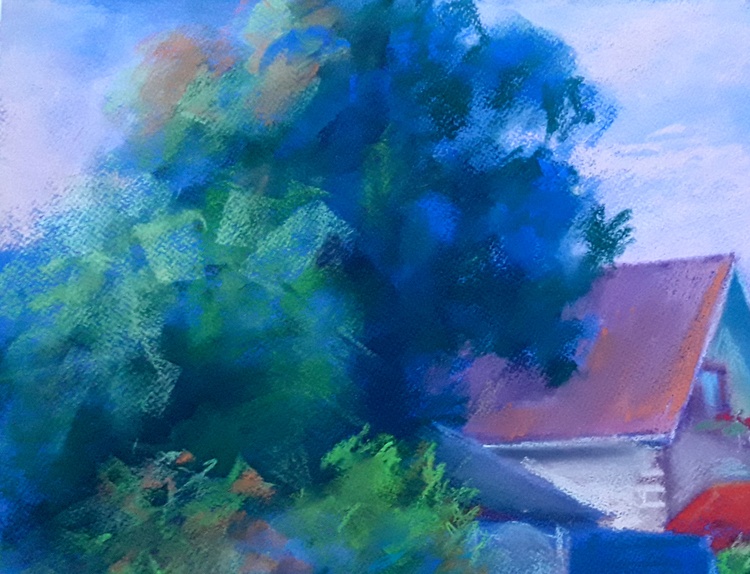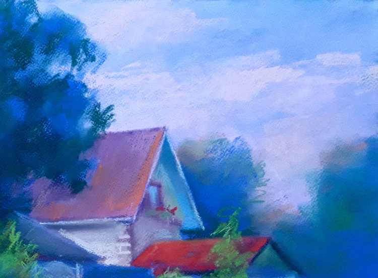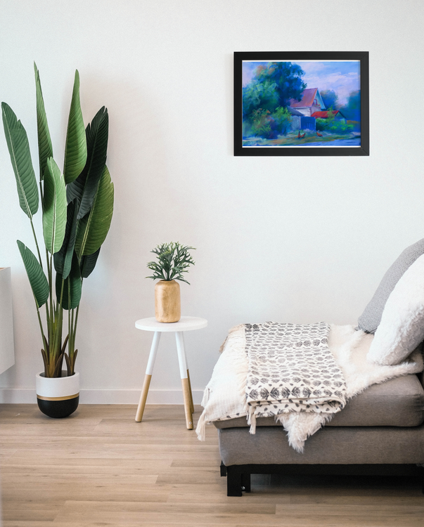 The painting "Red Roofs" by renowned Ukrainian artist Serdyuk Boris presents a peaceful village scene bathed in soft daylight. A quaint house with vibrant red roofs peeks through lush greenery, while a few chickens wander calmly in the foreground. The pastel palette of blues, greens, and gentle violets creates a dreamy, almost lyrical atmosphere that highlights the serenity of rural life. In this work, Serdyuk expresses a deep affection for the simplicity and charm of the Ukrainian countryside. The red roofs become a focal point — a symbol of warmth, home, and tradition — set against the soothing rhythm of nature. The painting evokes a sense of tranquil harmony, capturing the essence of everyday beauty in a setting untouched by time. 627