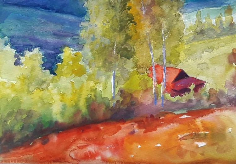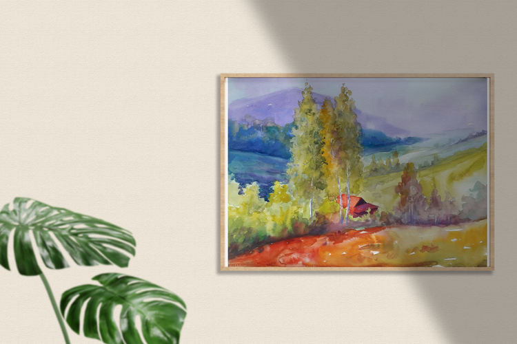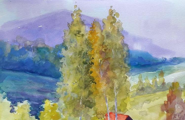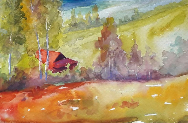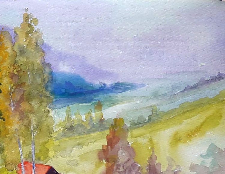 In the watercolor painting "Pre-Carpathian Motif" by renowned Ukrainian artist Serdyuk Boris, the viewer is transported to the tranquil foothills of the Carpathians. Through soft washes of color and a flowing composition, the artist captures a peaceful hillside scene, where golden fields and deep green forests meet the violet silhouettes of distant mountains. A modest red-roofed house nestled among tall birches draws the eye, adding a human touch to the vastness of nature. The layering of warm and cool tones, from sunlit meadows to the fading blues of the background, evokes the delicate beauty of early autumn in the Ukrainian countryside. Through this painting, Serdyuk expresses a deep emotional connection to his homeland—a place where nature offers not just scenery, but memory, silence, and rootedness. The work invites the viewer to pause, breathe, and feel the calm rhythm of village life under the Carpathian sky. 687