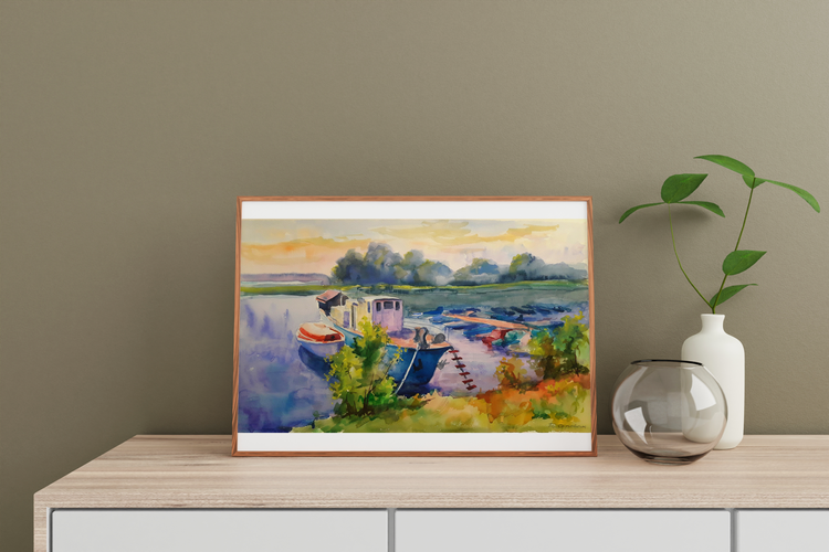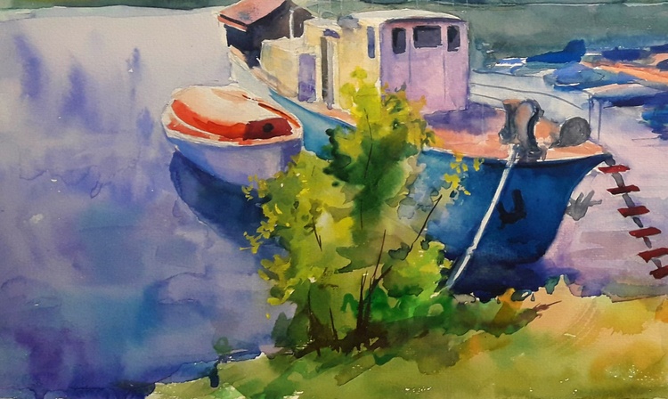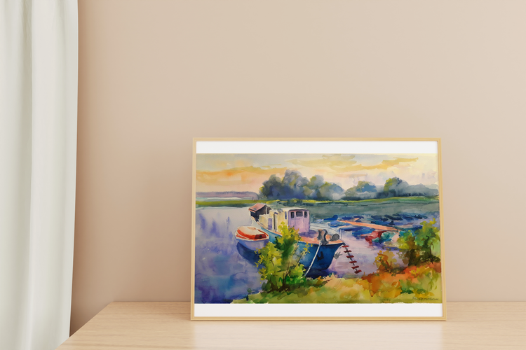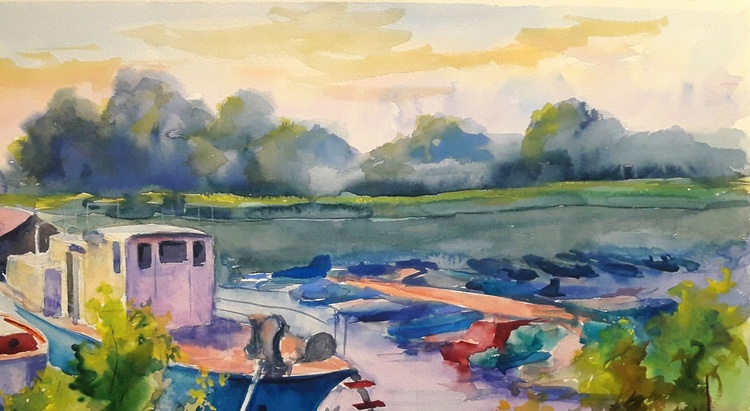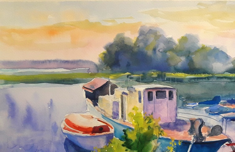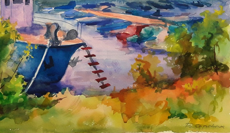 In the watercolor painting "Berth" by the acclaimed Ukrainian artist Serdyuk Boris, the viewer is invited into a tranquil riverside scene, where boats lie quietly moored at the dock under a soft, golden sky. The fluidity of the watercolor medium is masterfully used to convey the stillness of the water and the warm glow of the approaching evening. Serdyuk focuses on the quiet harmony between human activity and nature. The boats—humble, weathered, and gently resting—become symbols of pause and reflection. Surrounded by the lush greenery of the shore and the misty silhouettes of distant trees, the berth becomes a place of rest, transition, and calm. Through this peaceful composition, the artist expresses a moment of serenity, capturing the delicate balance between movement and stillness, work and rest, nature and man. It’s a quiet celebration of everyday beauty found in familiar, often overlooked places. 688