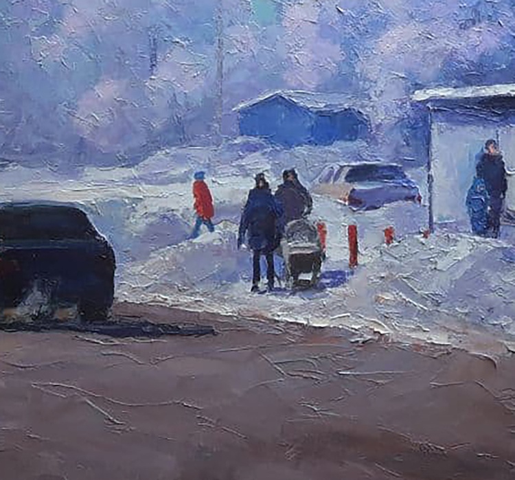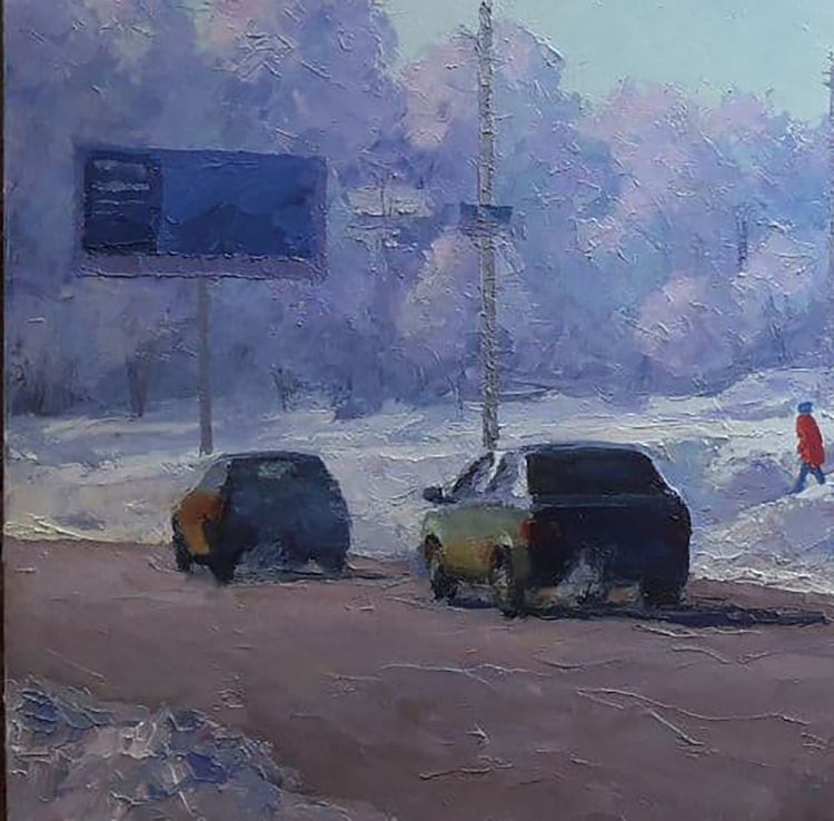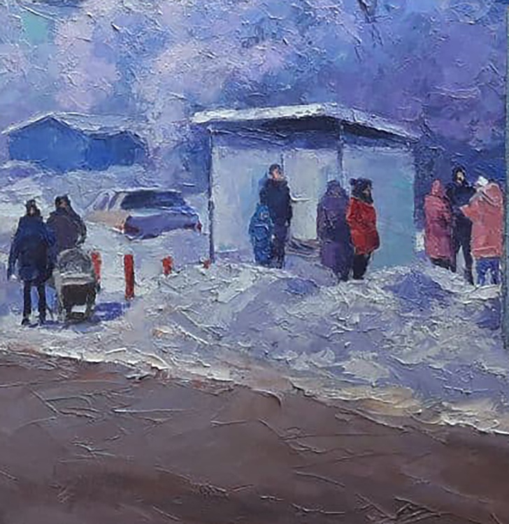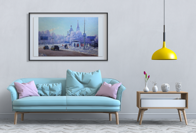 "Kremenchug. Cossack stop" is an oil painting by Ukrainian artist. The painting depicts a winter scene in the city of Kremenchug, with a lot of snow on the ground and a bus stop in the foreground. The white trees and the Orthodox church behind the trees are also visible in the painting. The painting has a very calming and serene atmosphere, which makes it perfect for hanging in any room in your home. The muted colors and simple composition are also very pleasing to the eye. This is a great choice for anyone who wants to add a touch of beauty and elegance to their home décor. 706