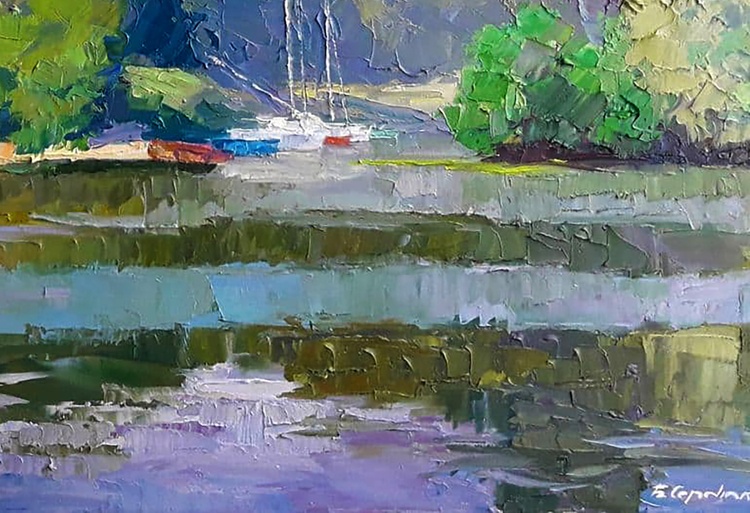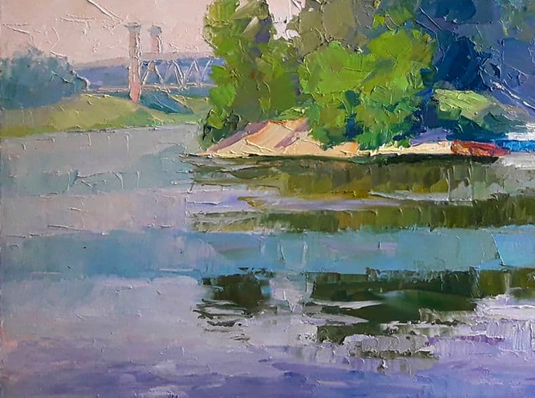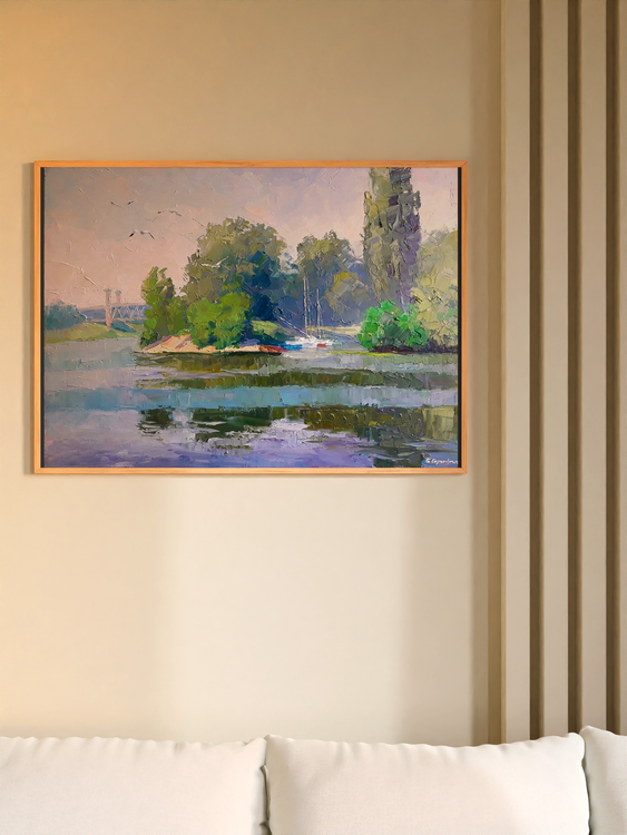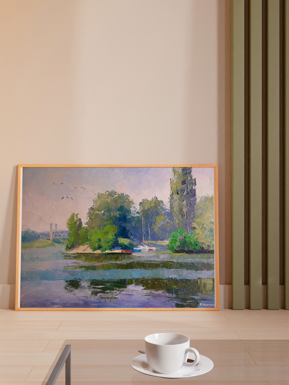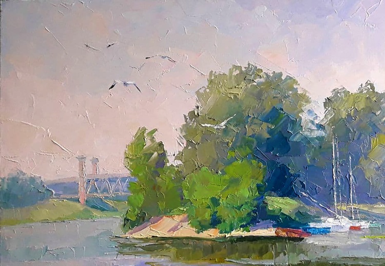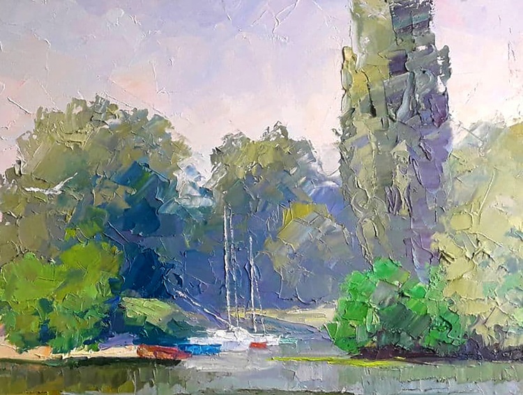 This is a beautiful oil painting called "Yachts on the Dnieper". It's a really stunning piece that would make a great addition to any art collection. The river Dnieper is a big river and this painting captures it perfectly. There are yachts sailing on the river and a forest on the shore - it's just an idyllic scene. This painting would make a great gift for anyone who loves art. 726