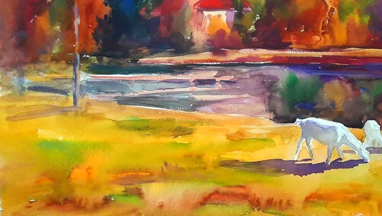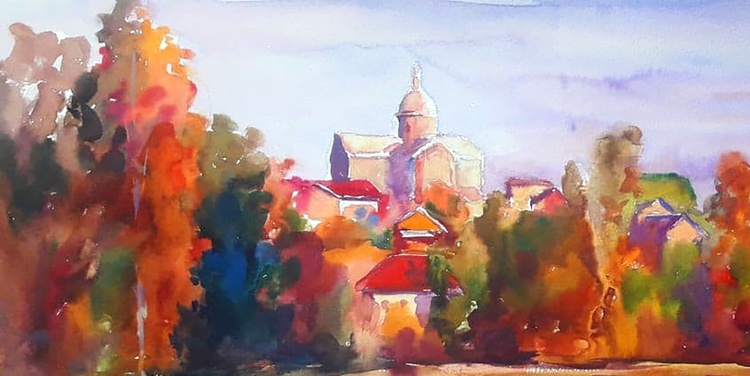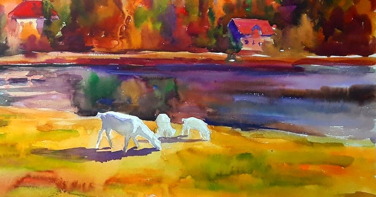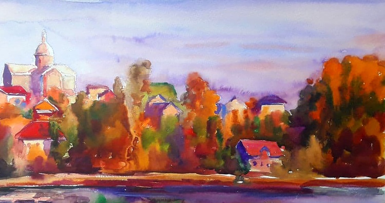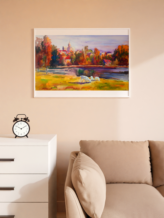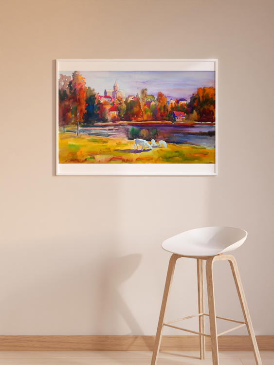 In the watercolor painting "October" by the celebrated Ukrainian artist Serdyuk Boris, autumn bursts into full glory. The scene captures a peaceful townscape nestled among fiery foliage, its colorful houses and church domes glowing in the golden light of the season. A quiet river reflects the warmth of the trees, while a few white goats graze calmly in the foreground, adding a pastoral charm and sense of life to the composition. With bold, saturated tones of orange, crimson, and violet, Serdyuk conveys the richness of October not just as a visual experience, but as a feeling—of ripeness, reflection, and slow transformation. The contrast between the lively palette and the tranquil mood highlights the harmony between nature and rural life. Through this work, the artist expresses deep affection for the Ukrainian countryside, evoking a timeless atmosphere where the rhythm of nature and community merge into one vivid, memorable moment. 729
