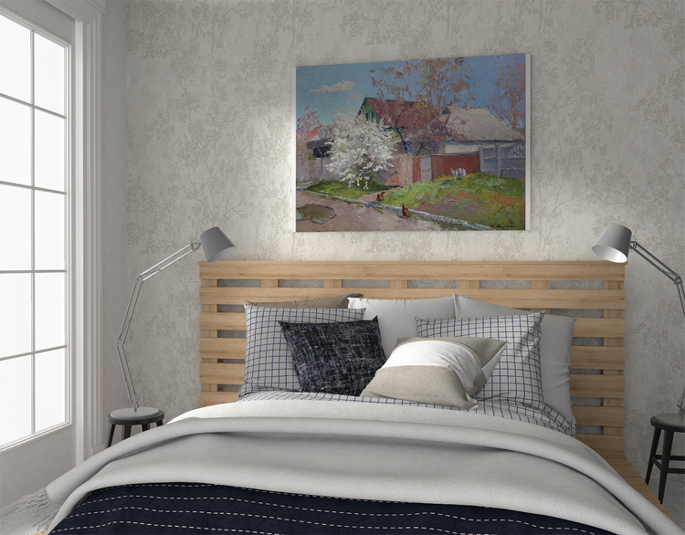 This charming oil painting depicts a typical village street scene, with a row of houses on one side and a green street with chickens walking on the other. The focal point of the painting is the beautiful cherry blossoms that are in full bloom, giving the scene a touch of elegance and serenity. The muted colors create a sense of calm and peace, making this painting perfect for any room in your home. Whether you hang it in your living room, bedroom, or office, it is sure to bring you a sense of tranquility and joy. 745