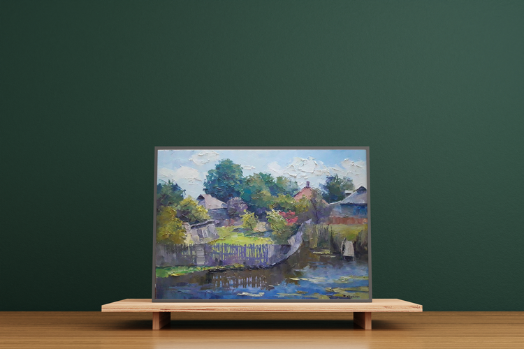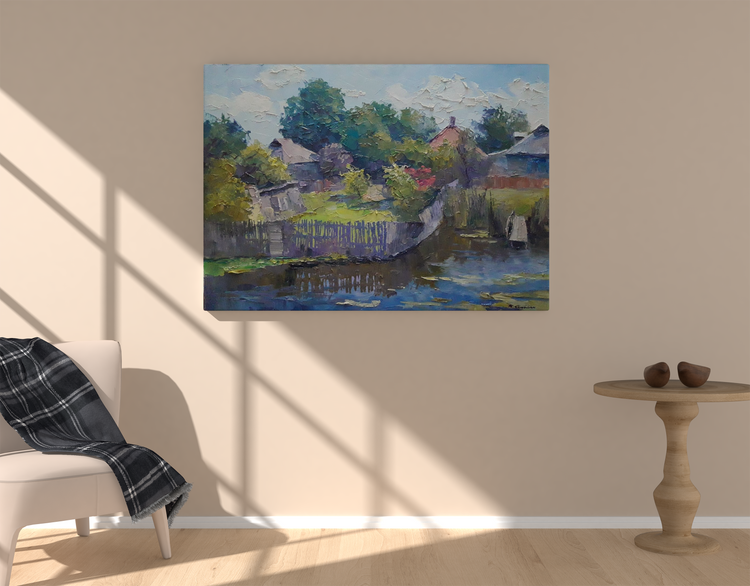 A warm day is an oil painting that captures the beauty and serenity of a village courtyard on a warm day. The scene is peaceful, with a pond near the courtyard and gardens surrounding it. The colors are soft and inviting, making the painting perfect for any room. The painting is sure to bring a sense of peace and relaxation to any home or office. 755