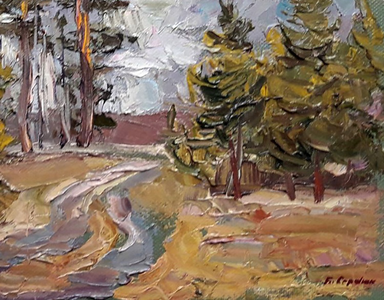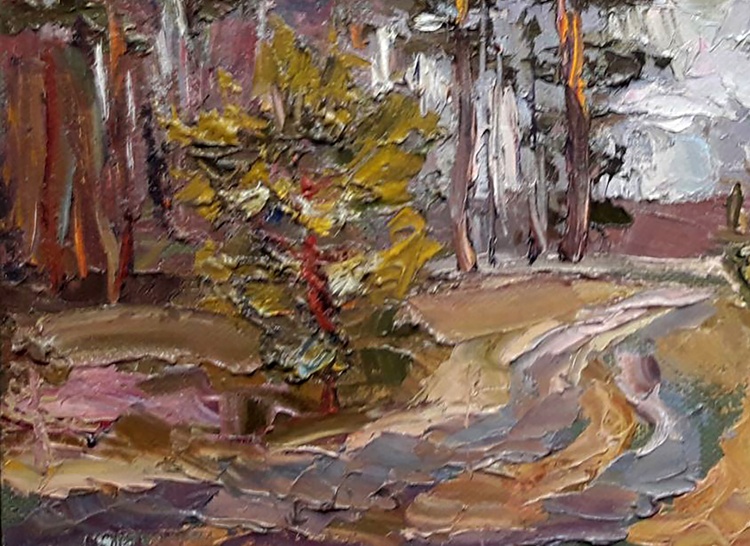 The painting Gloomy Day of Zholdaka by Ukrainian artist Serdyuk Boris captures a somber, overcast day in a quiet landscape. The textured brushstrokes and earthy tones depict a winding path through a forest, lined with tall, slightly barren trees and patches of green foliage. The muted colors and rough, impasto technique convey the moodiness of the day, evoking the weight and stillness of nature under a cloudy sky. Through this work, Boris may be expressing themes of solitude, introspection, and the contemplative beauty found in nature, even on a gloomy day. The scene invites the viewer to find peace in the subdued and reflective atmosphere. 851