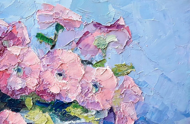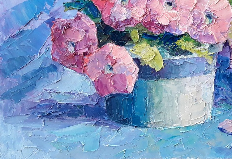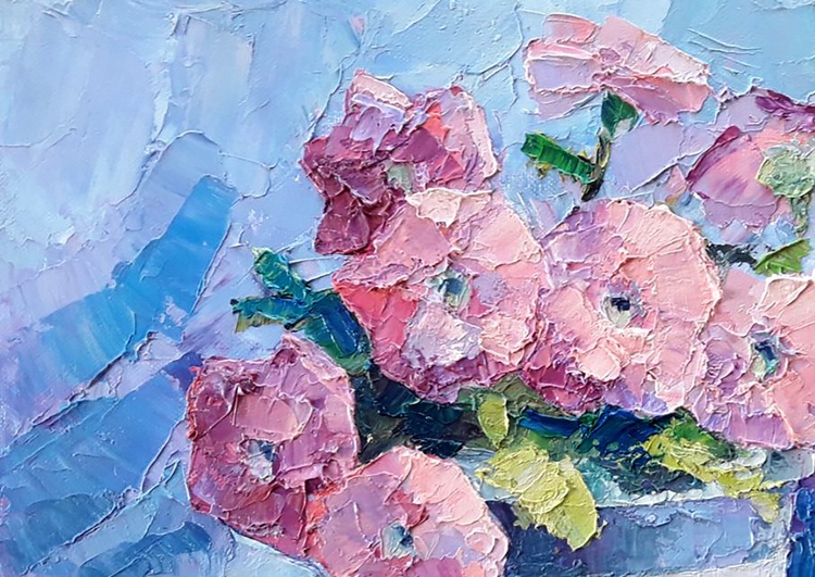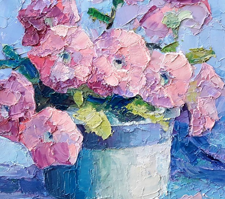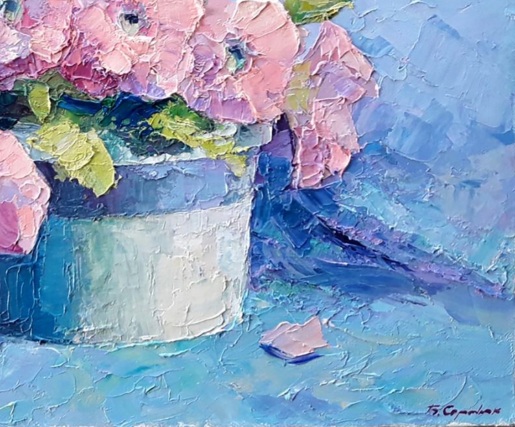 The painting Pink Petunia by Ukrainian artist Serdyuk Boris depicts a delicate bouquet of pink petunias arranged in a simple container against a soft, textured blue background. The impasto technique, with thick brushstrokes, gives the flowers a vivid, almost tangible quality, emphasizing their fragile beauty. The contrast between the gentle pinks of the blossoms and the cool blues of the background creates a serene, harmonious composition. Through this work, Boris may be expressing themes of elegance and simplicity, capturing the fleeting beauty of flowers in a way that feels both intimate and refreshing. This piece invites the viewer to appreciate the quiet charm of everyday nature. 853