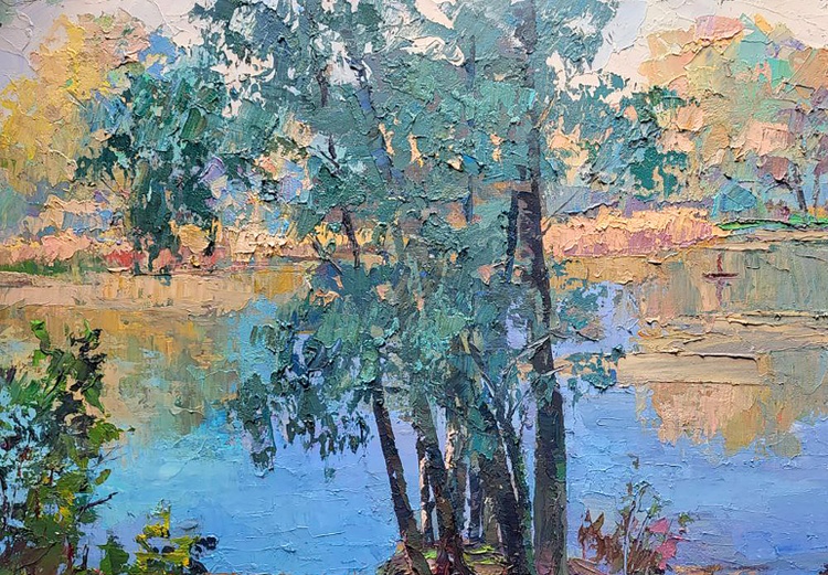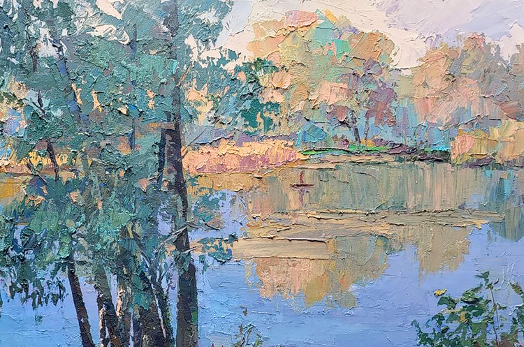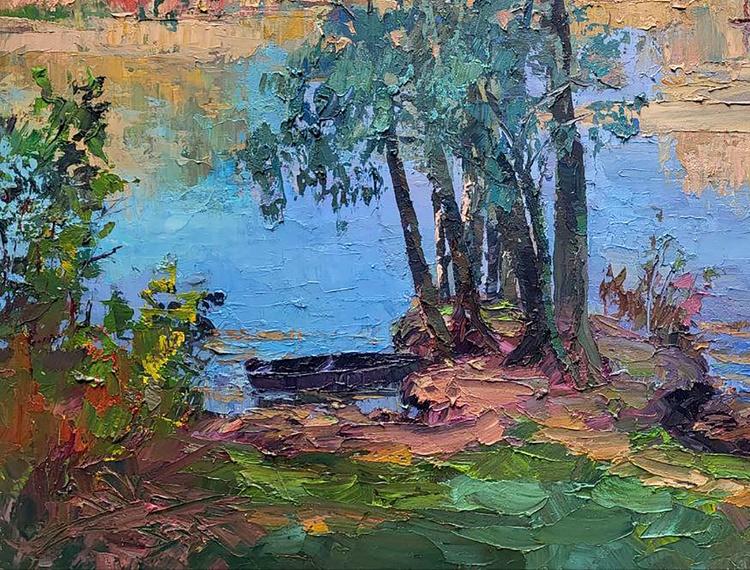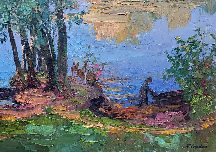 "Morning on the Lake" is a captivating oil painting that beautifully captures the serene ambiance of a summer landscape. The artist skillfully brings to life a picturesque scene with remarkable attention to detail and a harmonious color palette. The foreground of the painting is dominated by a glistening lake, its surface reflecting the soft hues of the rising sun. The water's calmness is accentuated by the absence of ripples, creating a mirror-like effect that mirrors the tranquility of the scene. The artist has employed a variety of blues, from pale cerulean to deep sapphire, to depict the water's subtle shifts in color. To the left of the lake, a solitary boat basks in the gentle morning light. Its wooden form is gracefully crafted, displaying intricate details that highlight the artist's technical prowess. The boat is painted in warm earthy tones, exuding a rustic charm that is further enhanced by the play of light and shadow on its surface. On the right side of the composition, another boat can be seen, moored close to the shore. Standing next to it is a man dressed in a simple gray attire, busily loading something into the vessel. His figure is delicately painted, capturing his focused and purposeful movements. The contrast between the man's monochromatic outfit and the vibrant surroundings emphasizes his role as an active participant in this tranquil setting. The immediate shoreline is adorned with lush green grass, which lends a touch of vibrancy to the scene. A couple of trees stand majestically in the center, their leafy canopies providing shade and shelter. The artist has meticulously depicted the interplay of light and shadow on the foliage, showcasing the intricate details of each individual leaf. In the distance, beyond the lake, lies a verdant forest, bathed in a hazy morning mist. The distant trees create a sense of depth and invite the viewer's gaze to wander, evoking a feeling of limitless exploration. Overall, "Morning on the Lake" is a masterfully crafted oil painting that transports the viewer to a tranquil summer morning. Through its meticulous attention to detail, balanced composition, and skillful use of color, the artwork captures the essence of a peaceful lakeside scene, inviting contemplation and a sense of serenity. 898