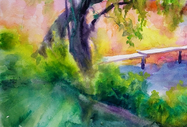 This watercolor painting, entitled "Reed Bridge," portrays a tranquil riverside scene replete with the gentle charm of nature. At the painting's heart lies a simple wooden bridge, modest in its construction, which crosses over a calm body of water. The bridge's reflection on the water's surface creates a subtle symmetry, disturbed only by the soft ripples that suggest a serene, dynamic element within the stillness. Above the bridge, a canopy of lush, verdant foliage bursts forth, depicted with loose, fluid brushstrokes that capture the lively dance of leaves in the light. The greenery's vibrancy suggests the fullness of life by the water's edge, with the trees' branches arching gracefully over the river, as if to watch over the bridge and the quiet passage it offers. The use of color in the background conveys the warmth of a setting or rising sun, with pastel pinks, oranges, and purples blending into a gentle gradient behind the trees. This warm backdrop contrasts with the cooler tones of the foreground, where various shades of green and hints of blue reflect the moisture-laden environment typical of riverbanks. Reeds and plants, illustrated with vertical strokes and varying degrees of intensity, line the water's edge. They create an impression of depth and texture, drawing the eye to the water's edge, where the details become less distinct, mimicking the way objects appear when viewed through the gentle distortion of moving water. "Reed Bridge" evokes a sense of peace and a connection with nature. It is as if time slows down, inviting the viewer to take a moment to appreciate the simple beauty of a quiet spot where man-made and natural elements coexist harmoniously. The painting's loose, expressive technique captures not just a visual likeness of the scene, but the mood and atmosphere, encapsulating the essence of a serene escape within the landscape. 954