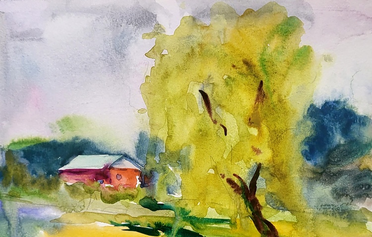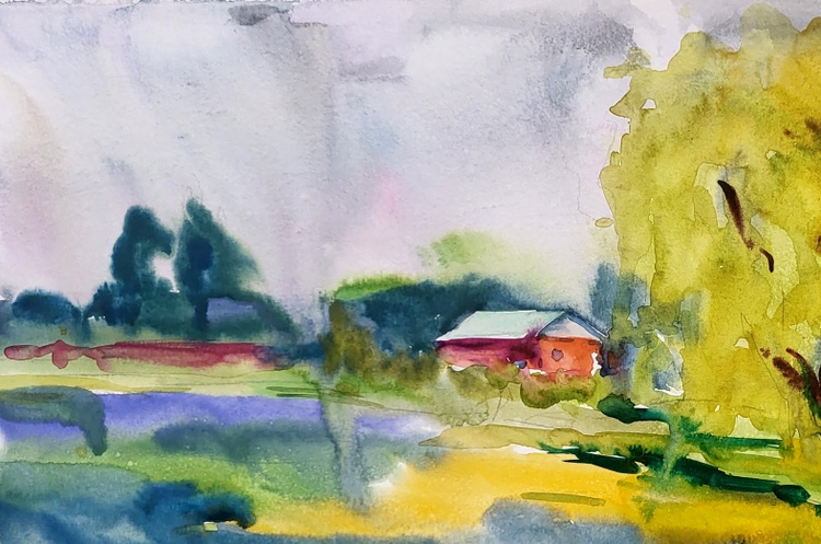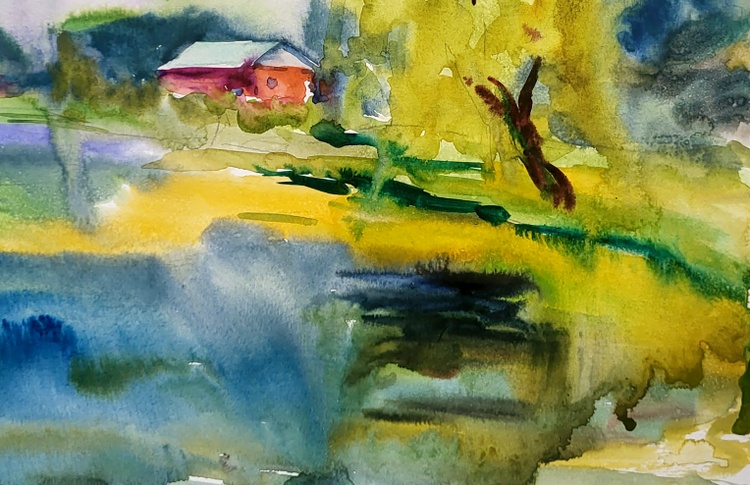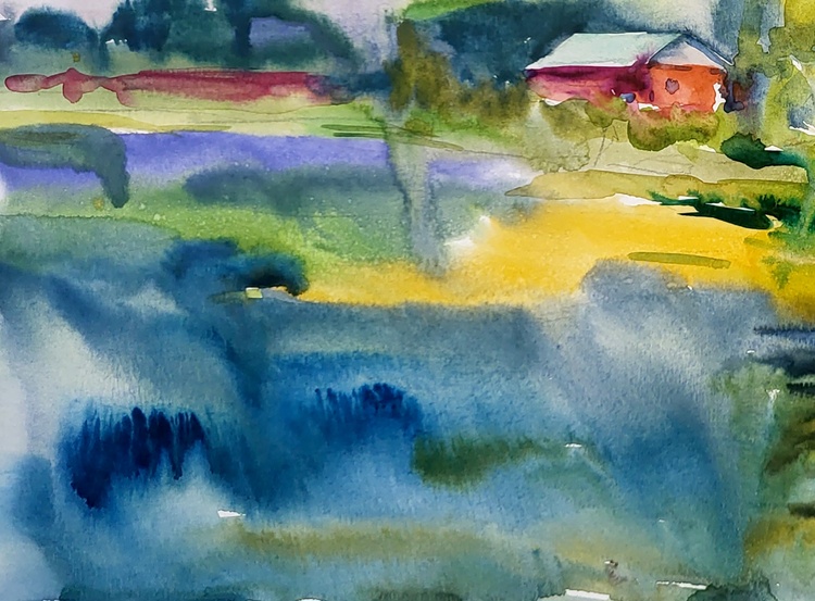 The watercolor painting titled "On the Pond" captures an impressionistic snapshot of a day by a still body of water, possibly a pond or a small lake. The scene is alive with fluid brushstrokes and a vibrant play of colors that give it a dreamlike quality. The focus of the painting is the pond itself, taking up the lower half of the canvas. It is depicted with bold blues and greens, suggesting the depth and movement of water. The reflection on the water's surface is skillfully rendered, capturing the essence of the surrounding landscape in a semi-abstract form that dances between representation and pure color expression. Above the pond, the middle ground is occupied by a riot of yellow and green hues, likely representing a sunlit grassy area or perhaps the changing colors of vegetation in the fall. The brightness of this area draws the eye and adds a sense of luminosity to the scene. Toward the upper half of the painting, a few structures can be seen, with one particularly noticeable house or barn painted in a striking shade of pink. This pop of color against the more subdued background adds a focal point to the landscape and suggests human presence without overtly dominating the natural setting. Trees flank the structures, their forms simplified and abstracted into swathes of darker green and purple. These darker tones provide a contrast to the lighter colors used in the rest of the composition and help to create a sense of depth. The sky is painted with a light wash, the clouds barely suggested, allowing the vivid colors of the landscape to take center stage. There's an overall sense of warmth and gentle light that seems to bathe the entire scene. This painting, "On the Pond," with its loose brushwork and emphasis on color over detail, communicates the essence of a tranquil day spent by the water, where the boundaries between land, water, and sky are softly blended into one harmonious vision. 959