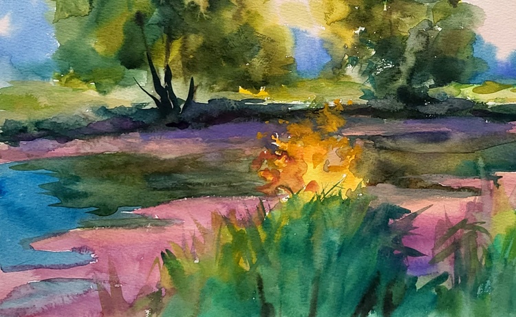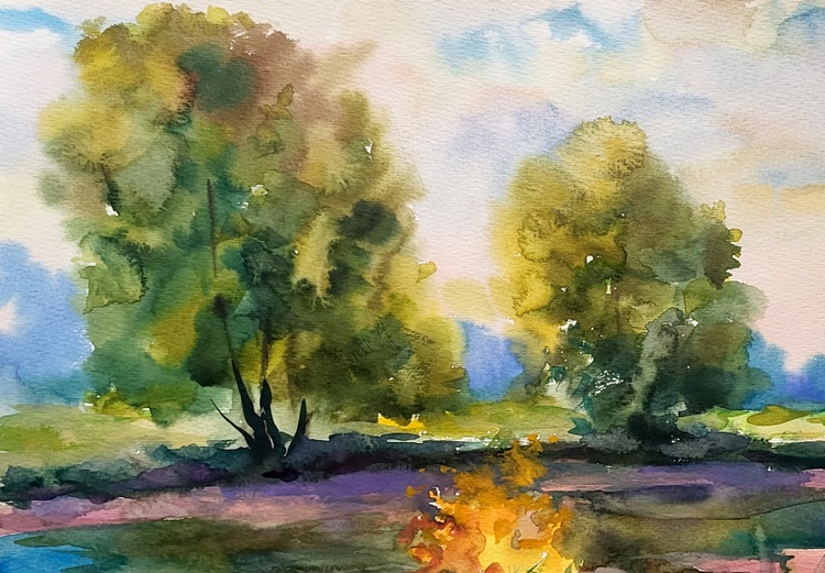 The watercolor landscape "Eve" is an expressive depiction of a serene evening in a natural setting. The painting is imbued with a sense of calm and the tranquility of dusk. At the heart of the composition is a body of water, perhaps a pond, rendered in reflective blues and purples that suggest the coolness of the evening. Hints of warmer tones near the water's edge could imply the last touches of a sunset kissing the surface, with fiery oranges and reds blending into the cool blues of the water, creating a beautiful contrast that captures the essence of the setting sun’s reflection. Above the pond, a congregation of trees dominates the midground. These are painted with a varied palette of greens, with strokes and dabs of yellow and light green suggesting the lingering light of the fading day. The foliage is lush, with the watercolor's fluidity perfectly lending itself to the depiction of the leaves and branches. The trees stand as silent witnesses to the day’s end, their canopies soft and ethereal against the sky. The sky itself is a tapestry of blues, purples, and soft yellows, mingling together to create a gentle backdrop. The clouds are loosely defined, their soft forms contributing to the overall peacefulness of the scene. In the foreground, grasses and plants are suggested with upward strokes of green, hinting at a wild, untamed nature of the land close to the water's edge. These strokes add a layer of texture and depth, giving the viewer a sense of being present in the grasses and looking out towards the pond and the trees beyond. "Eve" encapsulates a moment of stillness and beauty at the end of the day, where nature's elements combine in a harmonious symphony of color and light, inviting contemplation and a connection with the natural world. 960